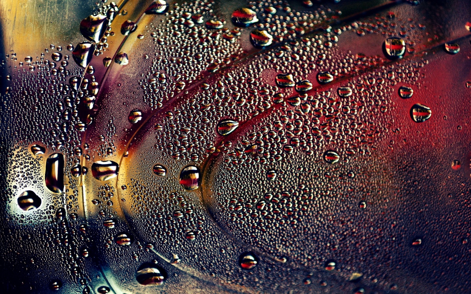 Description: A close up of water droplets on a glass surface with a red and yellow background and a black background.