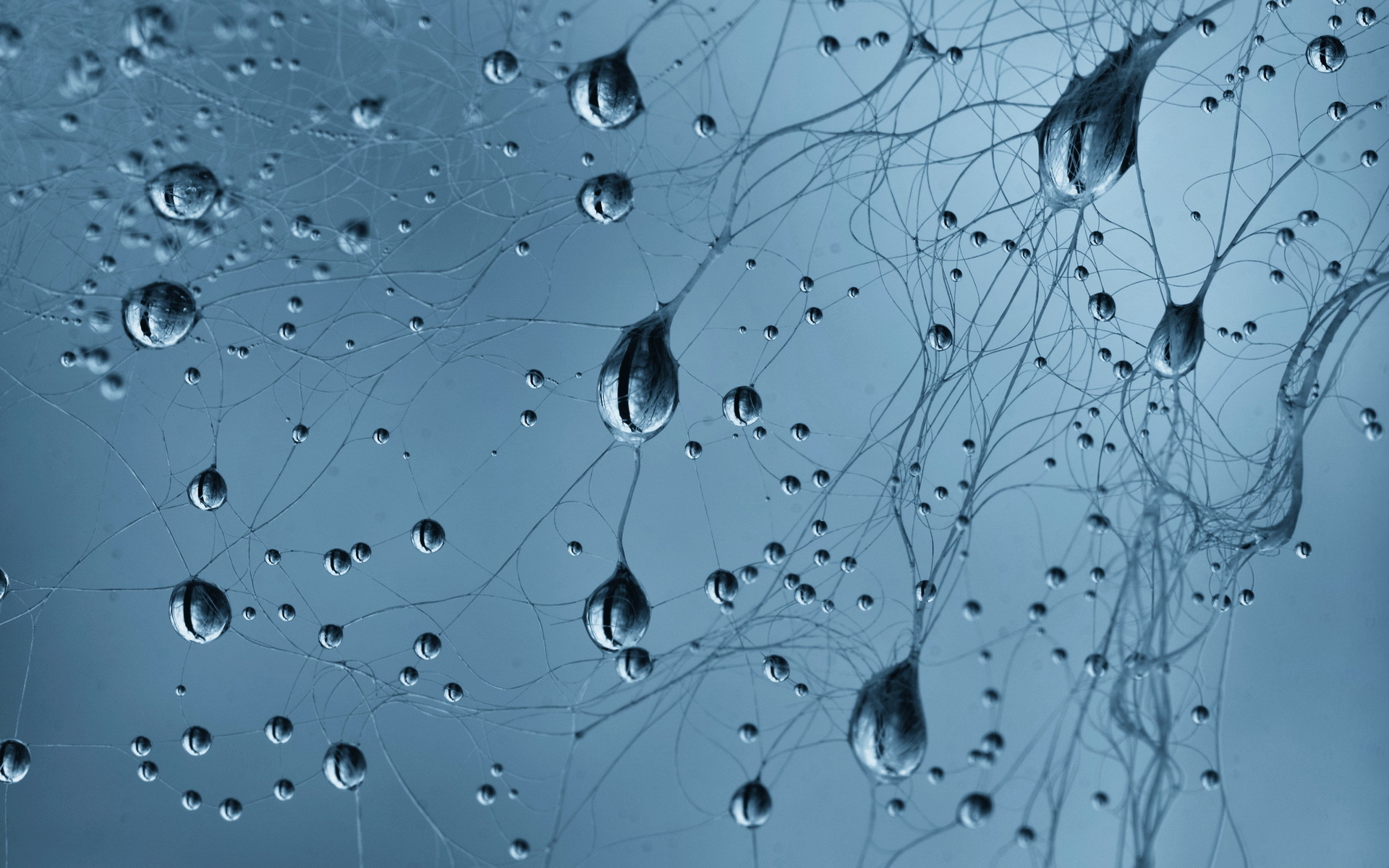 Description: A bunch of water droplets on a window with a blue background and a tree branch in the background with lots of water droplets.
