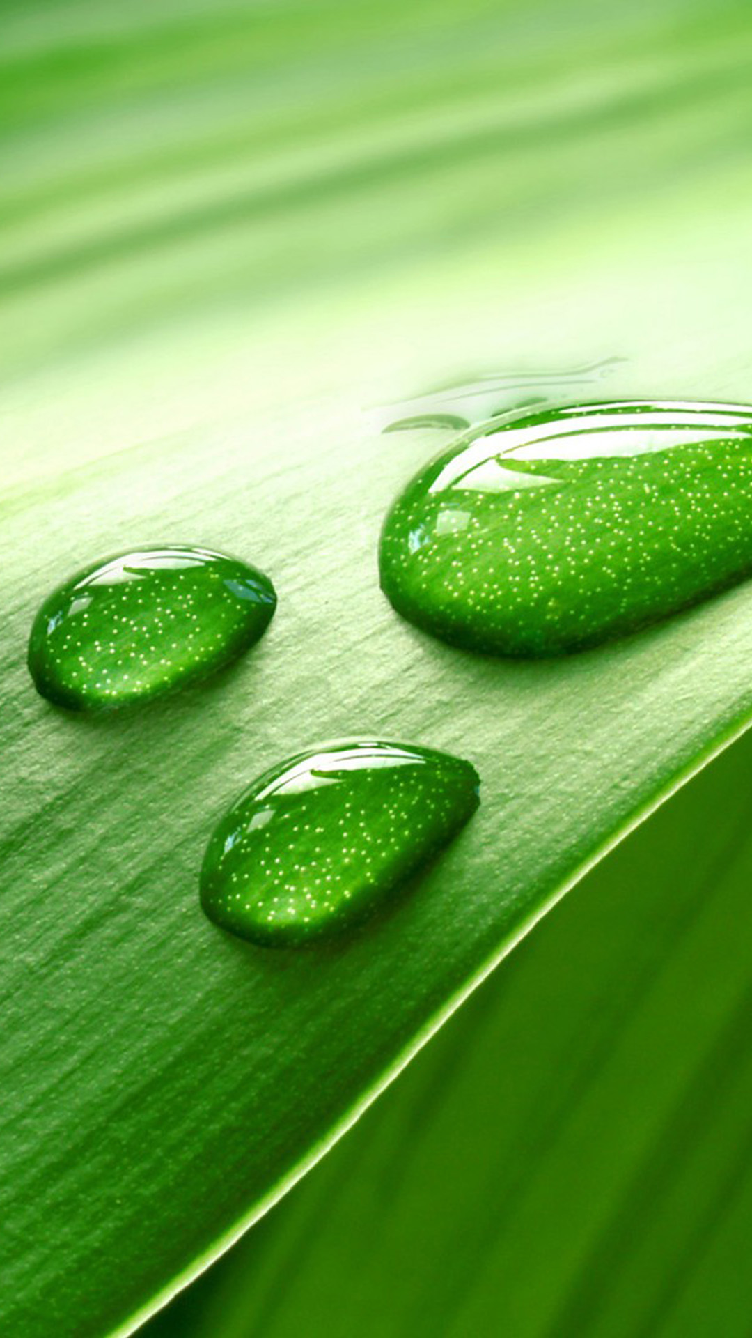 Description: Three drops of water on a green leaf with a green background and a green leaf with a green leaf.