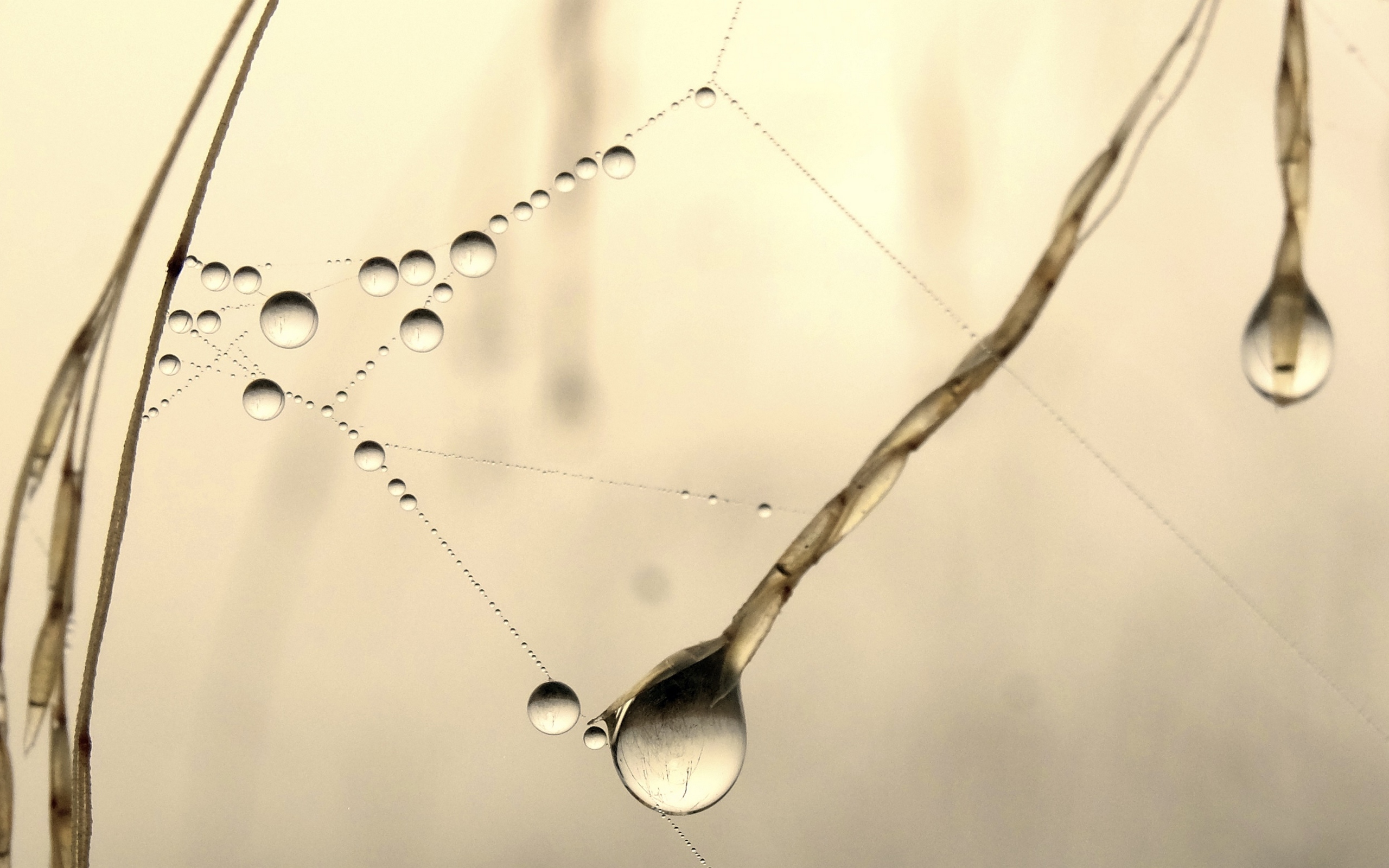 Description: A spider web with water drops hanging from it's webs and a spider web hanging from it's web.