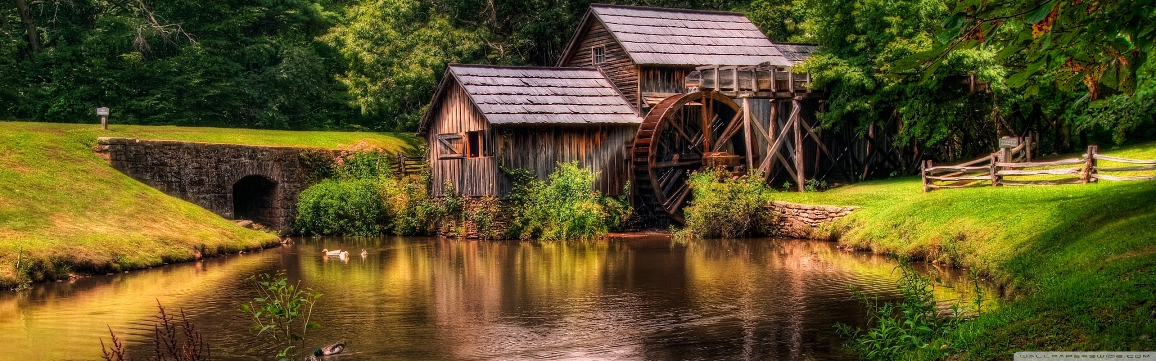 Description: A water mill with a wooden building next to it on a river bank with a duck in the water.