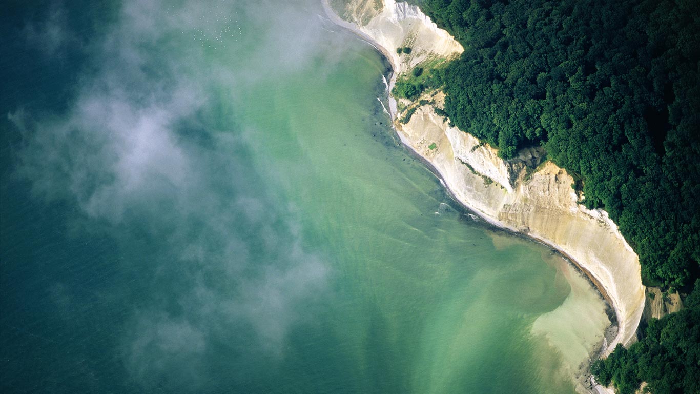 Description: A view of a body of water from above with a plane flying over it and a forest below it.