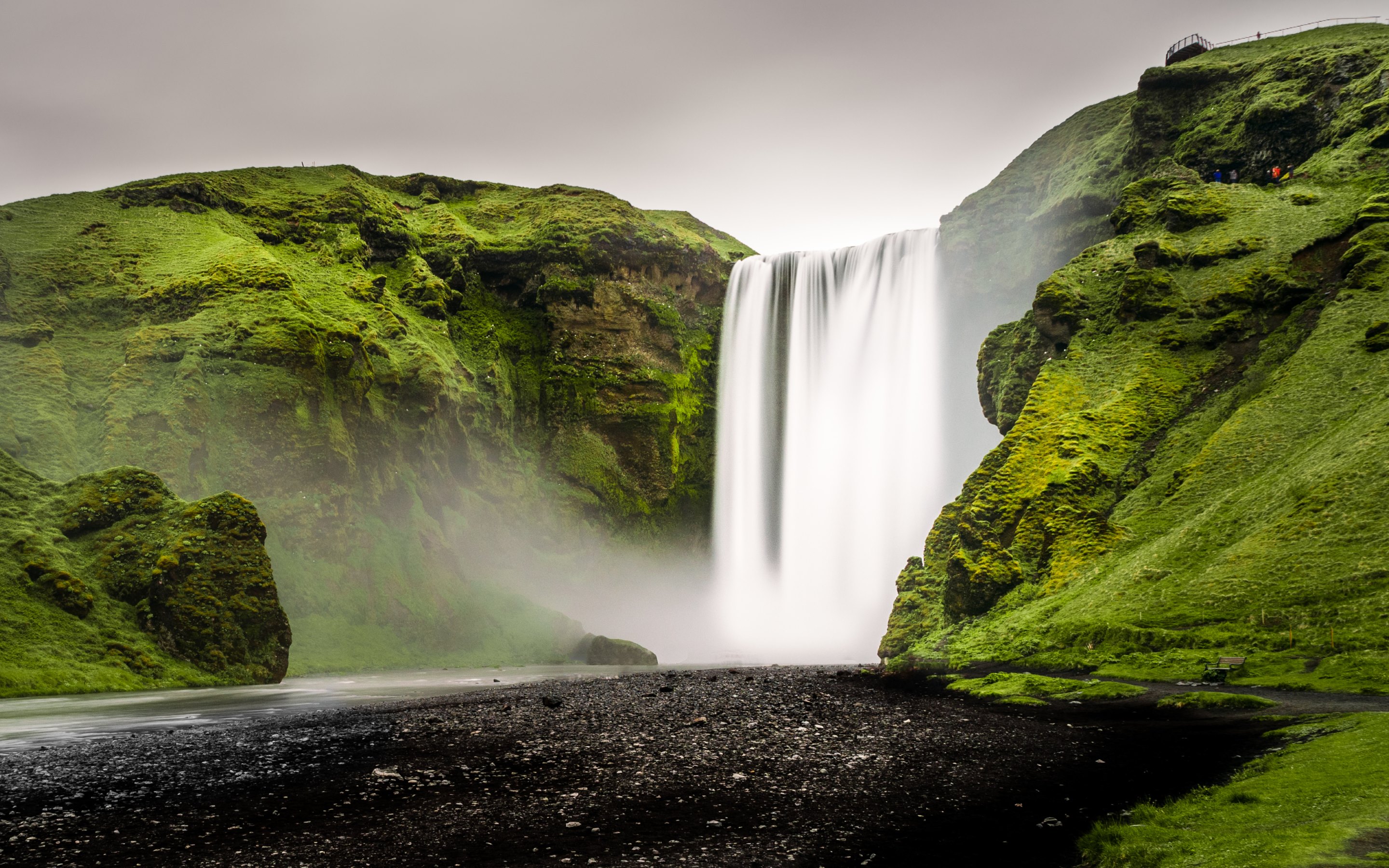Description: A waterfall with a black sand beach below it and a person standing on the edge of the waterfall looking at the water.