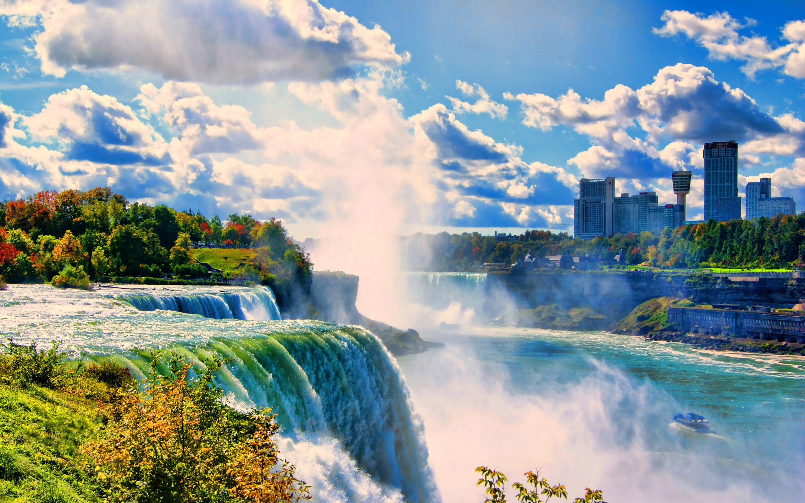 Description: A waterfall with a boat in the water near a city and a river with a waterfall in the background.