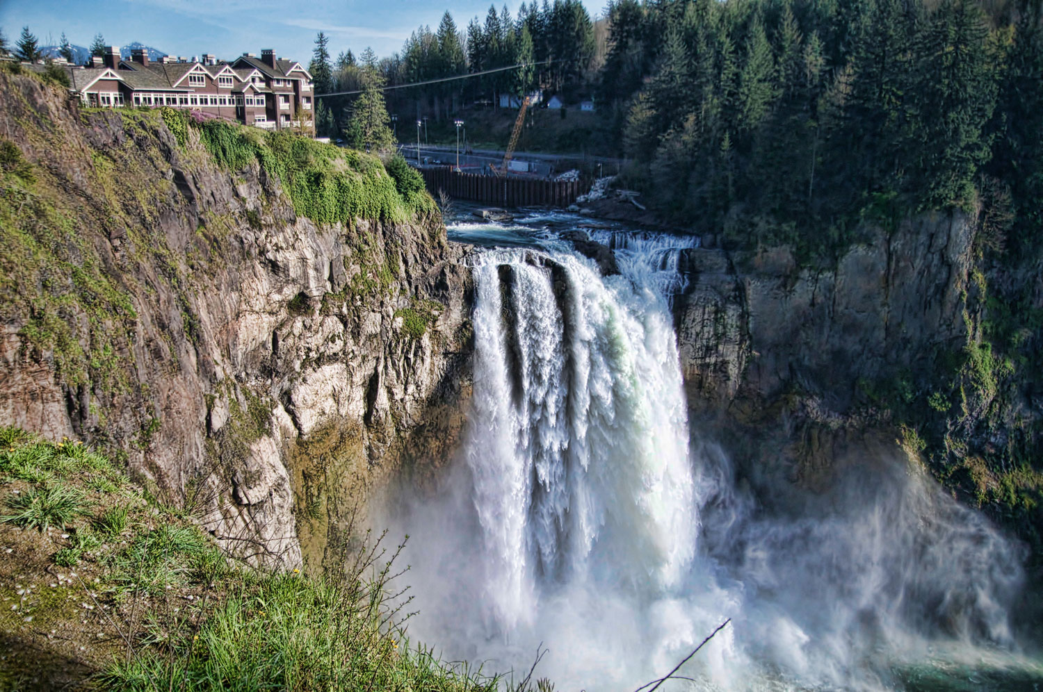 Description: A waterfall with a bridge in the background and a building on the other side of it with a river running below.