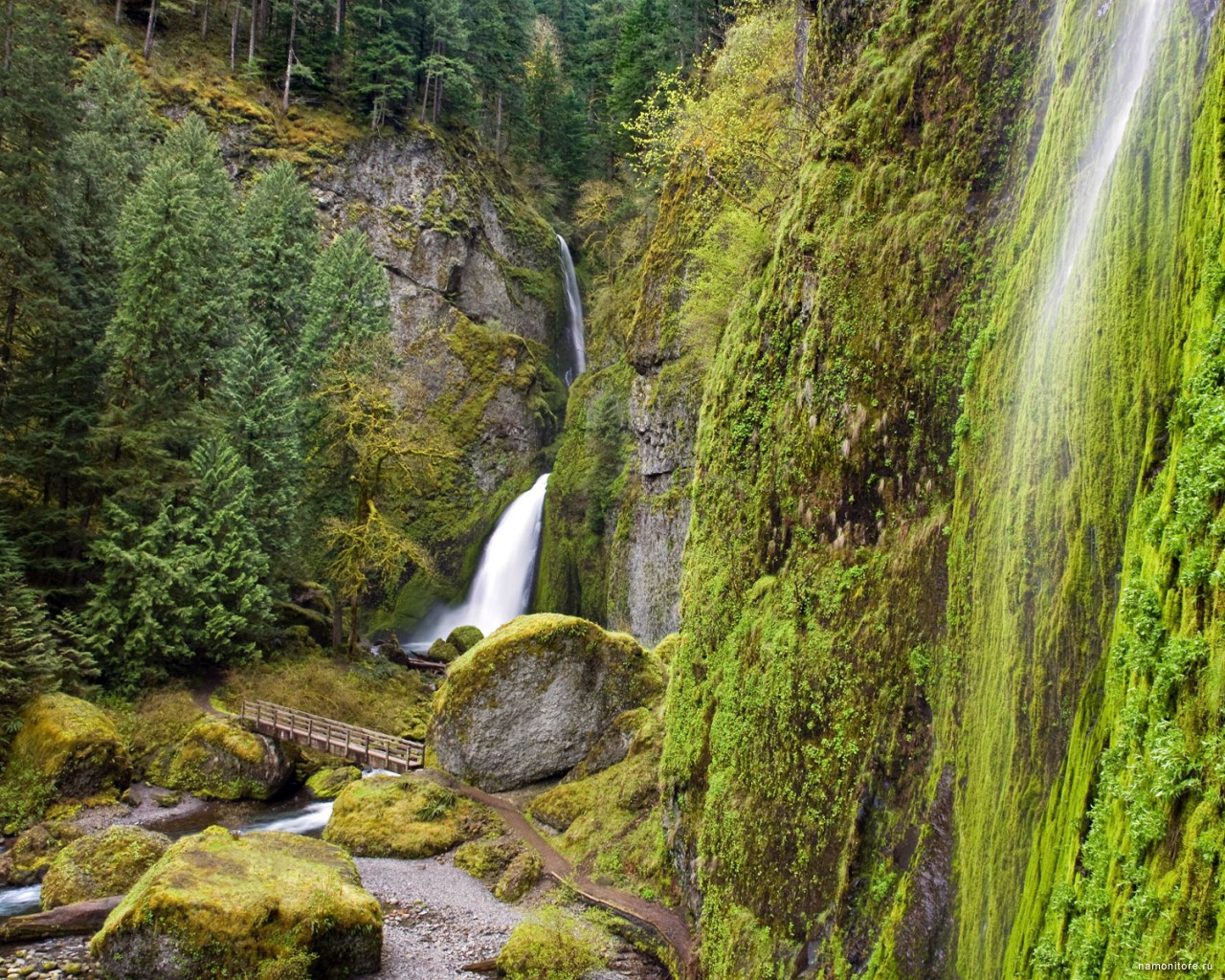 Description: A waterfall with a bridge and a forest in the background with moss growing on the rocks and trees around it.