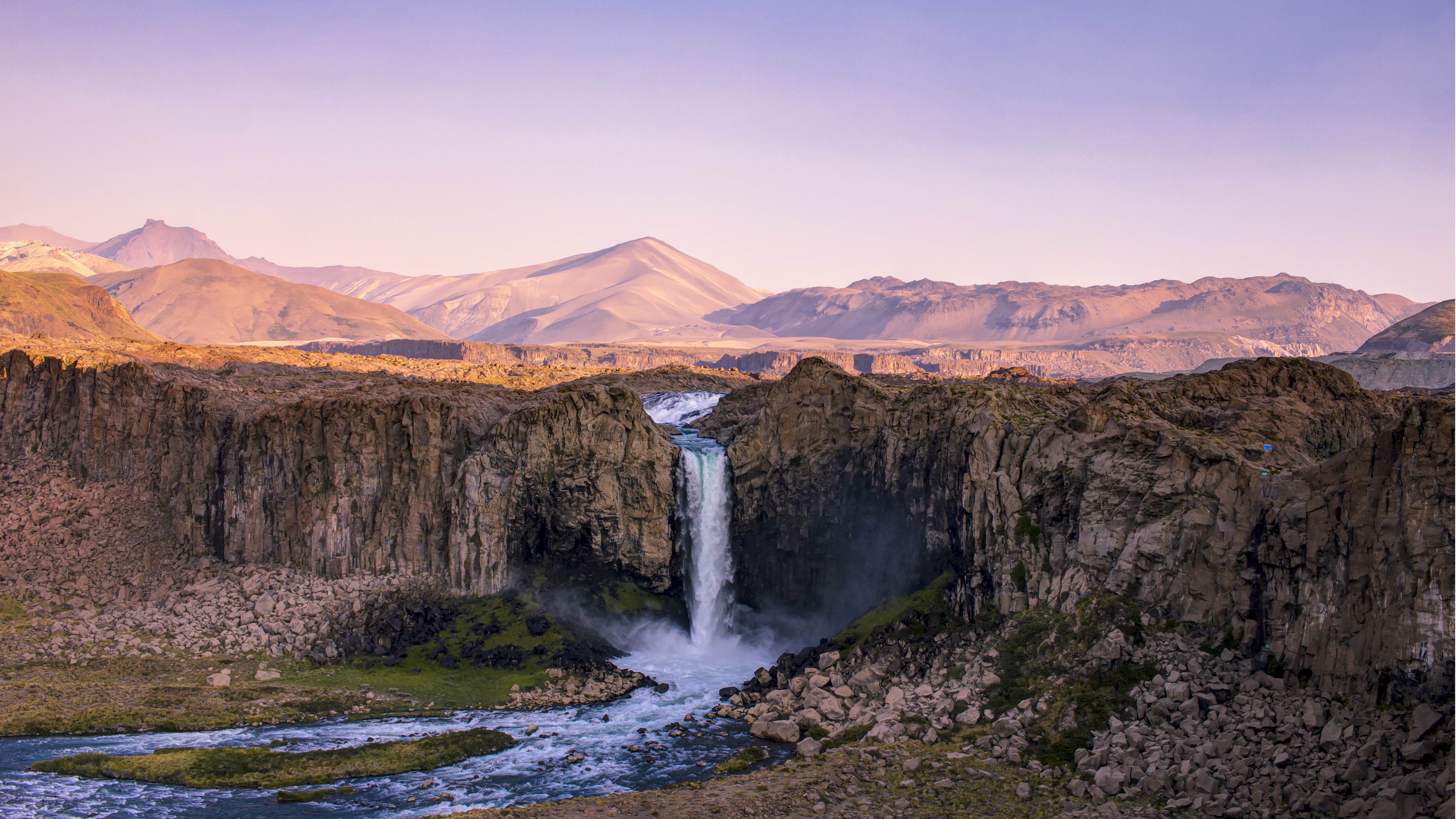 Description: A waterfall in a canyon with mountains in the background and a river running through it in the foreground.