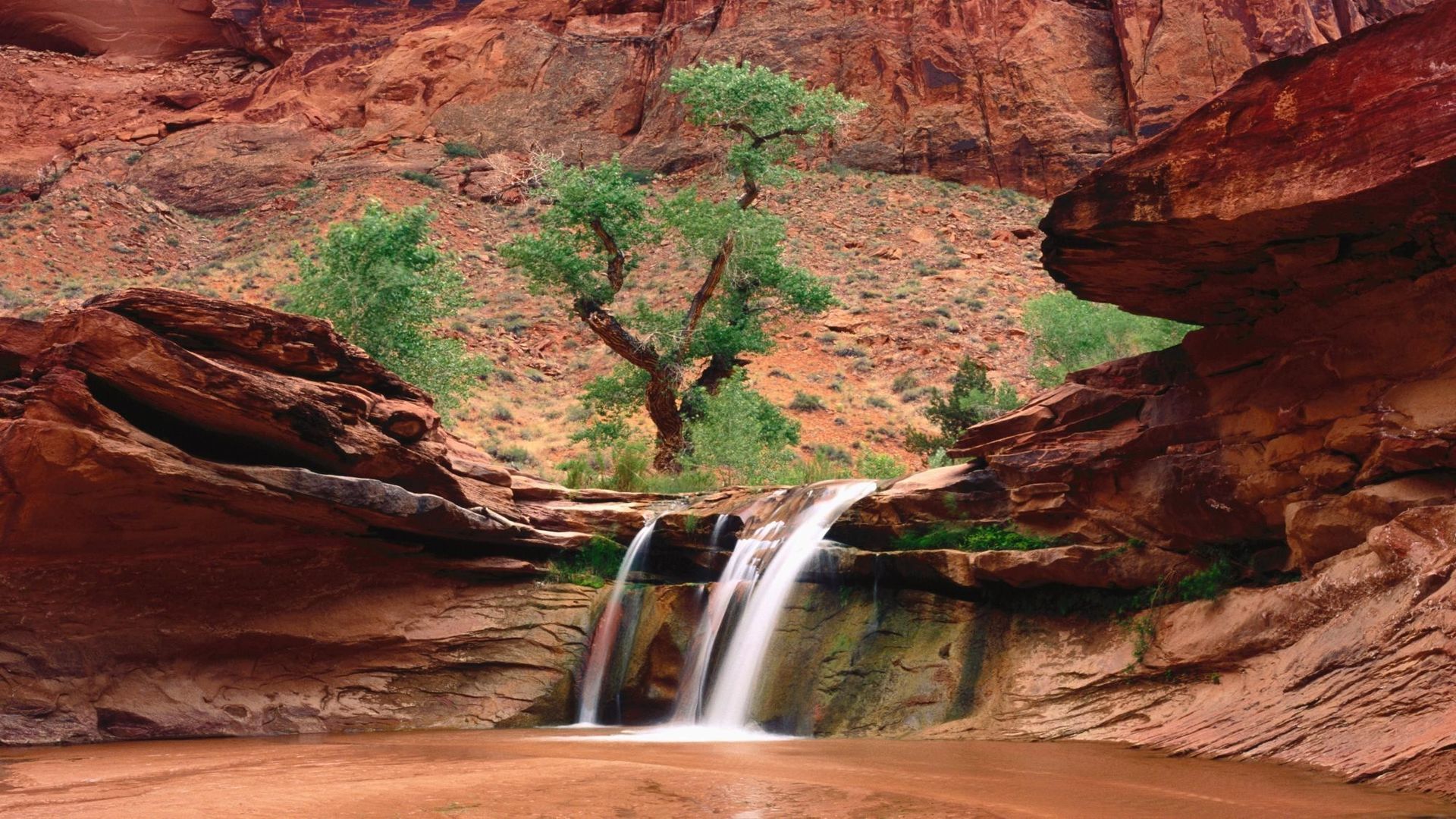 Description: A waterfall in a canyon with a tree in the middle of it and a rock wall in the background.
