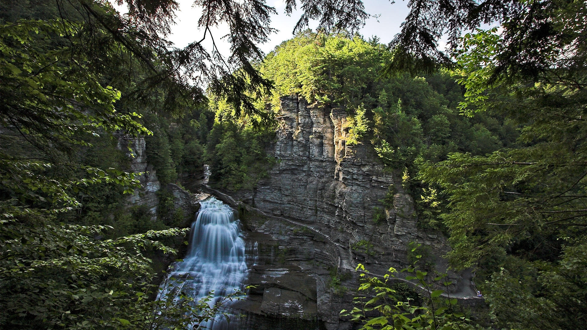 Description: A waterfall in a forest with a bridge going over it and a forest below it with lots of trees.