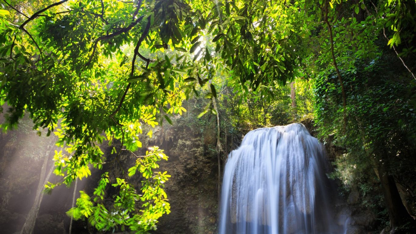 Description: A waterfall in the middle of a forest with sunlight coming through the trees and leaves on the ground and on the ground.