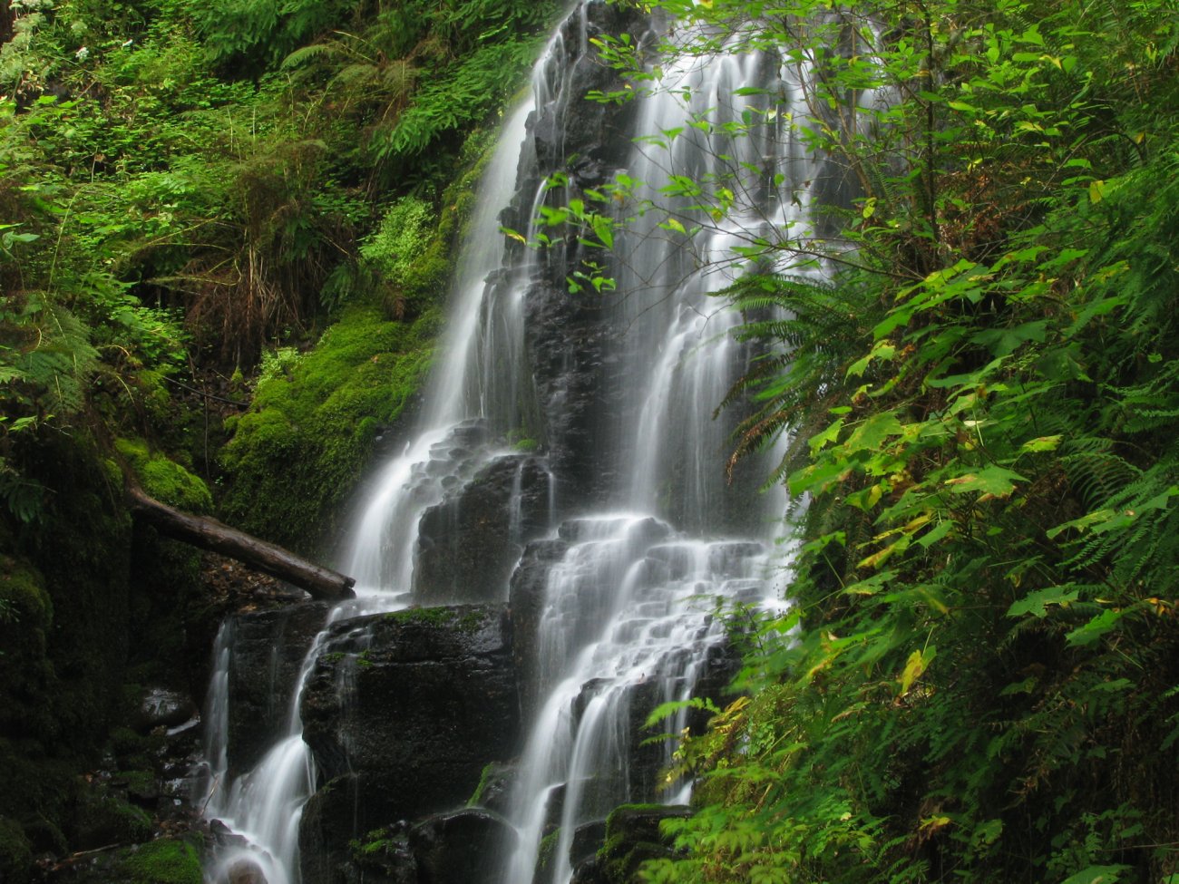 Description: A waterfall in the middle of a forest with lots of trees and bushes around it and a person standing in the water.