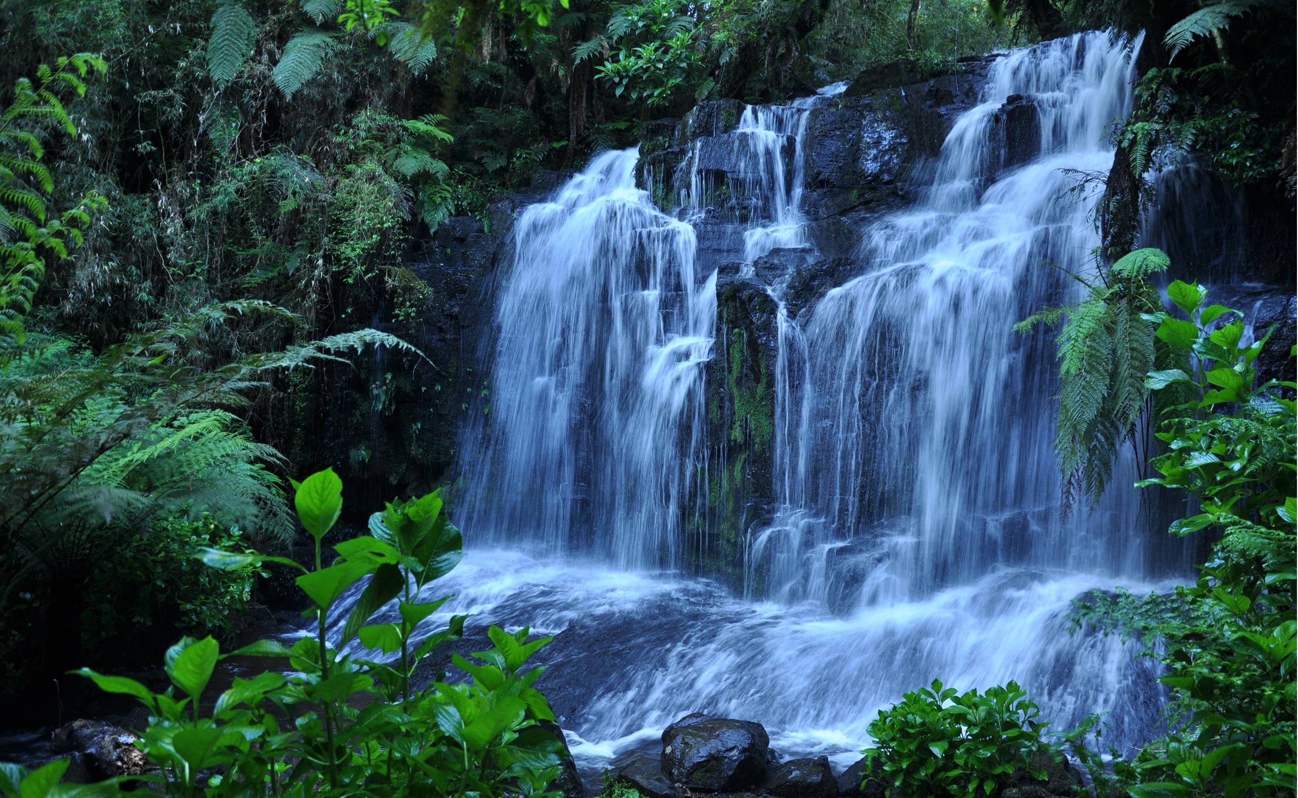 Description: A waterfall in the middle of a forest filled with trees and plants.