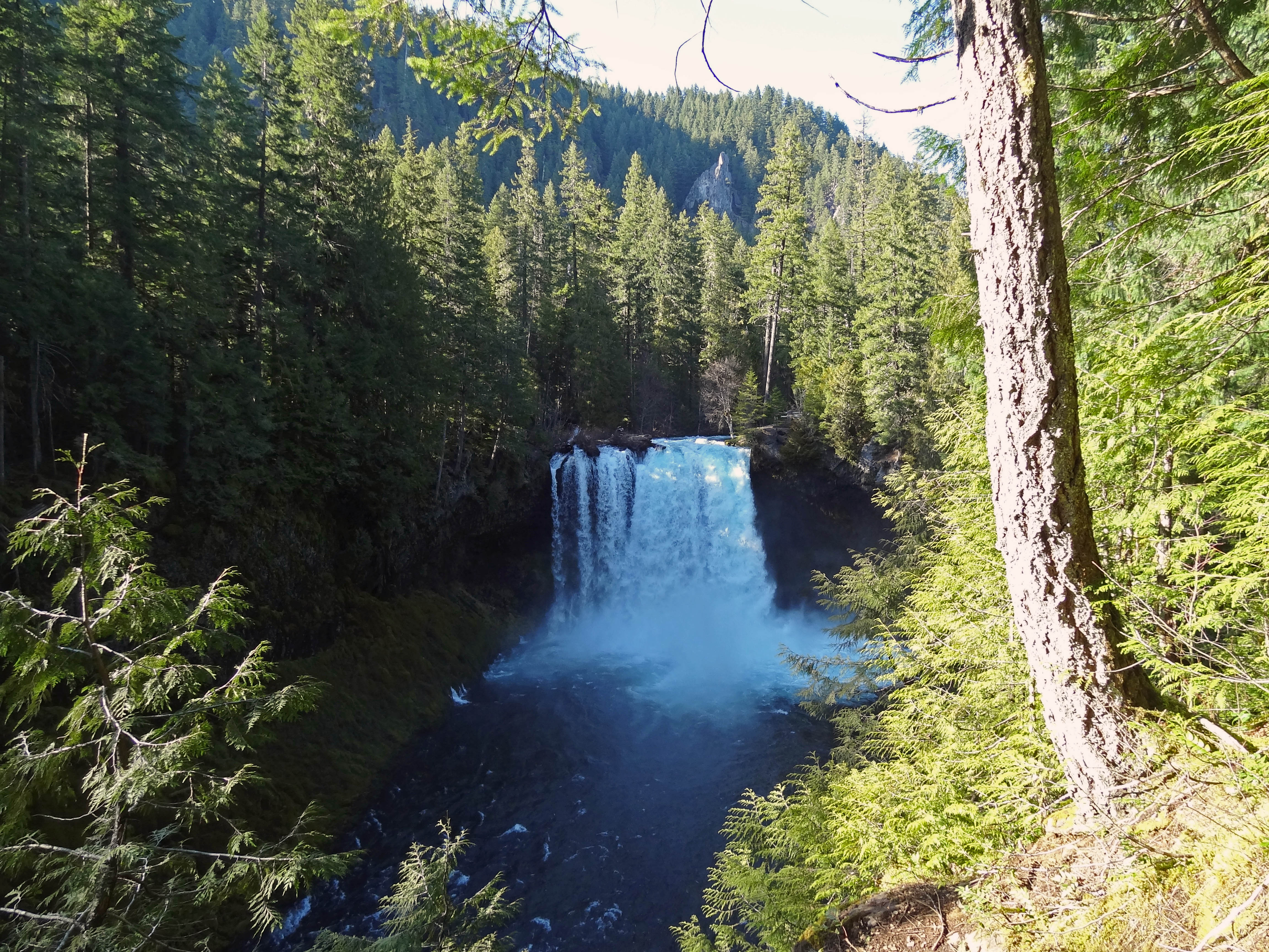 Description: A waterfall in the middle of a forest with trees around it and a river running through it with water coming out of the falls.