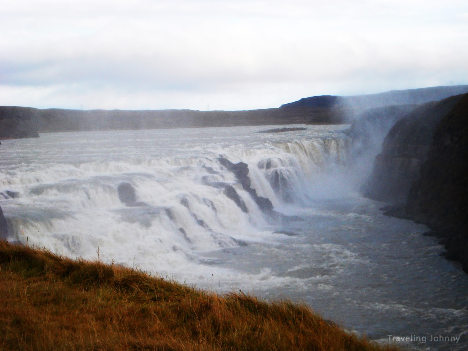 Description: A large waterfall with a man standing on top of it's side next to a river and a cliff.