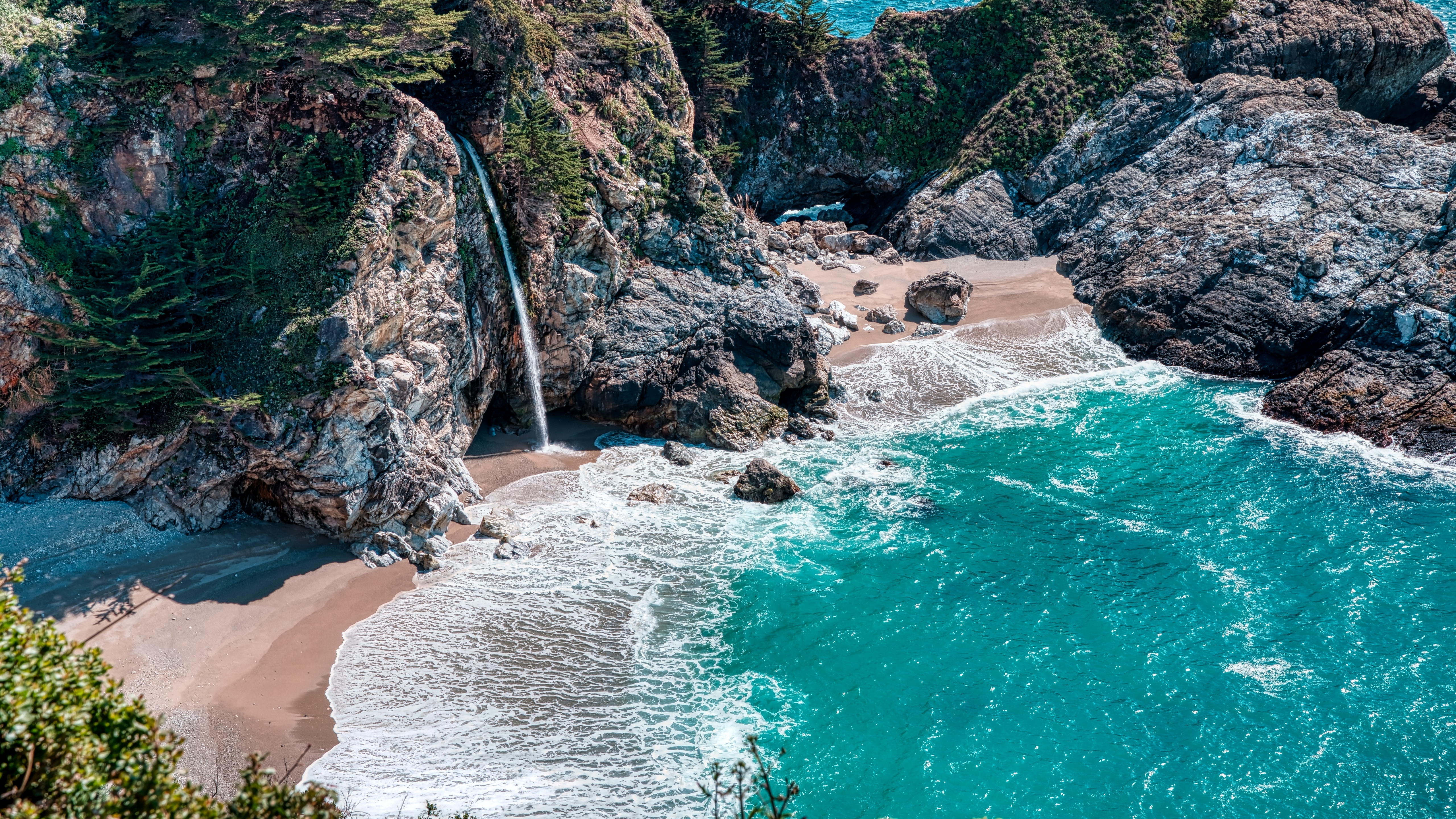 Description: A waterfall is coming out of the ocean into the beach next to a rocky cliff and beach area with a sandy shore.