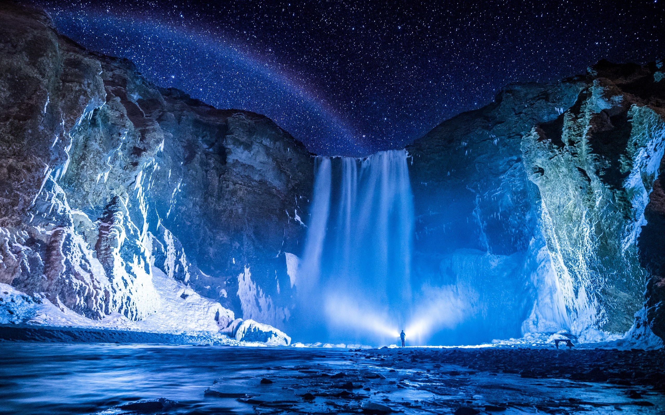 Description: A waterfall with a rainbow in the sky above it and a man standing in the water below it at night.