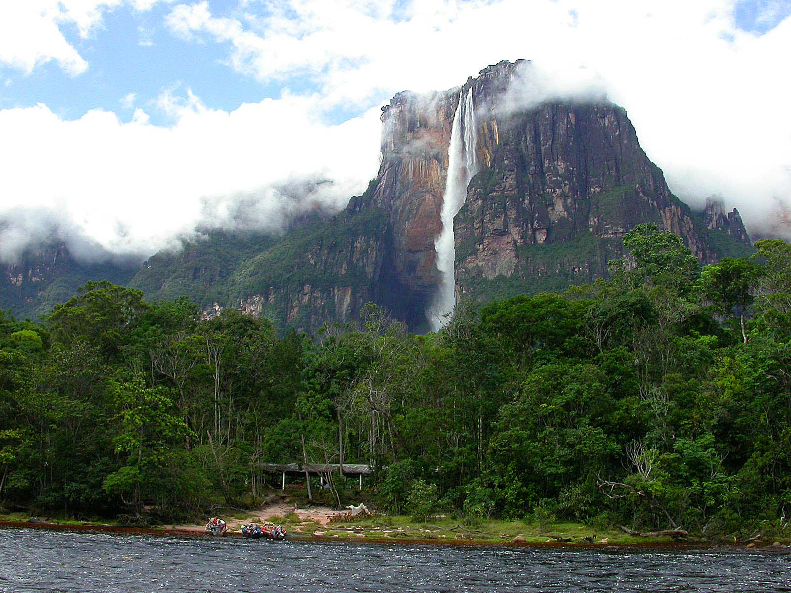 Description: A waterfall is in the distance behind a river with a boat in it and a bridge in the foreground.