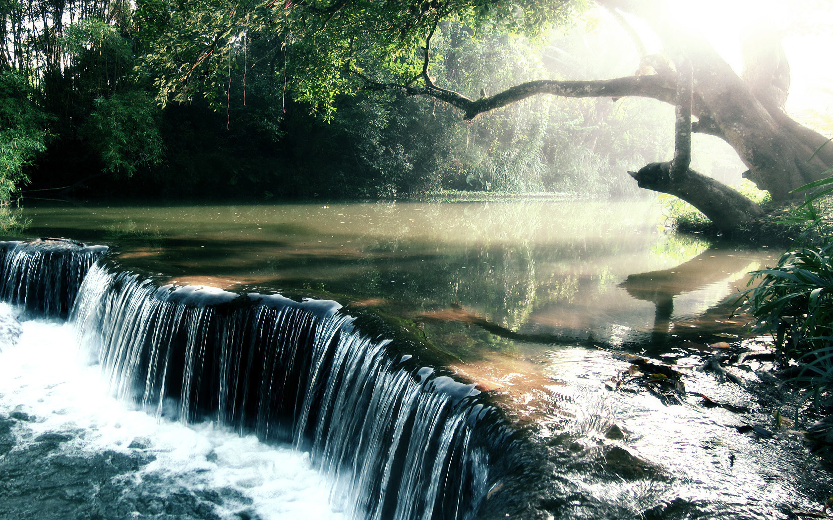 Description: A waterfall in a river surrounded by trees and water with sun shining through the leaves on the water and a branch hanging over the water.