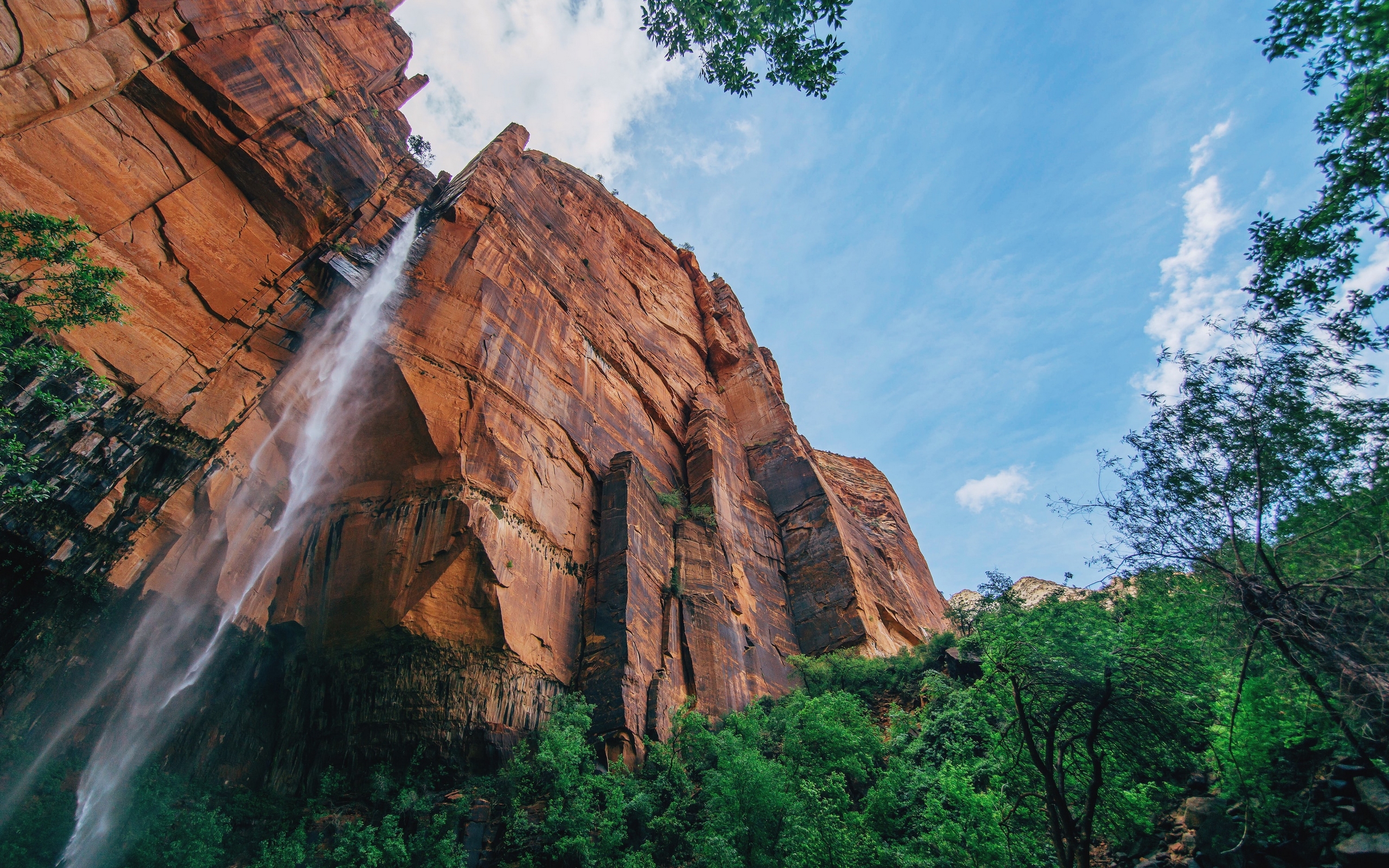Description: A waterfall is coming out of a large rock formation into the air with trees around it and a blue sky above.