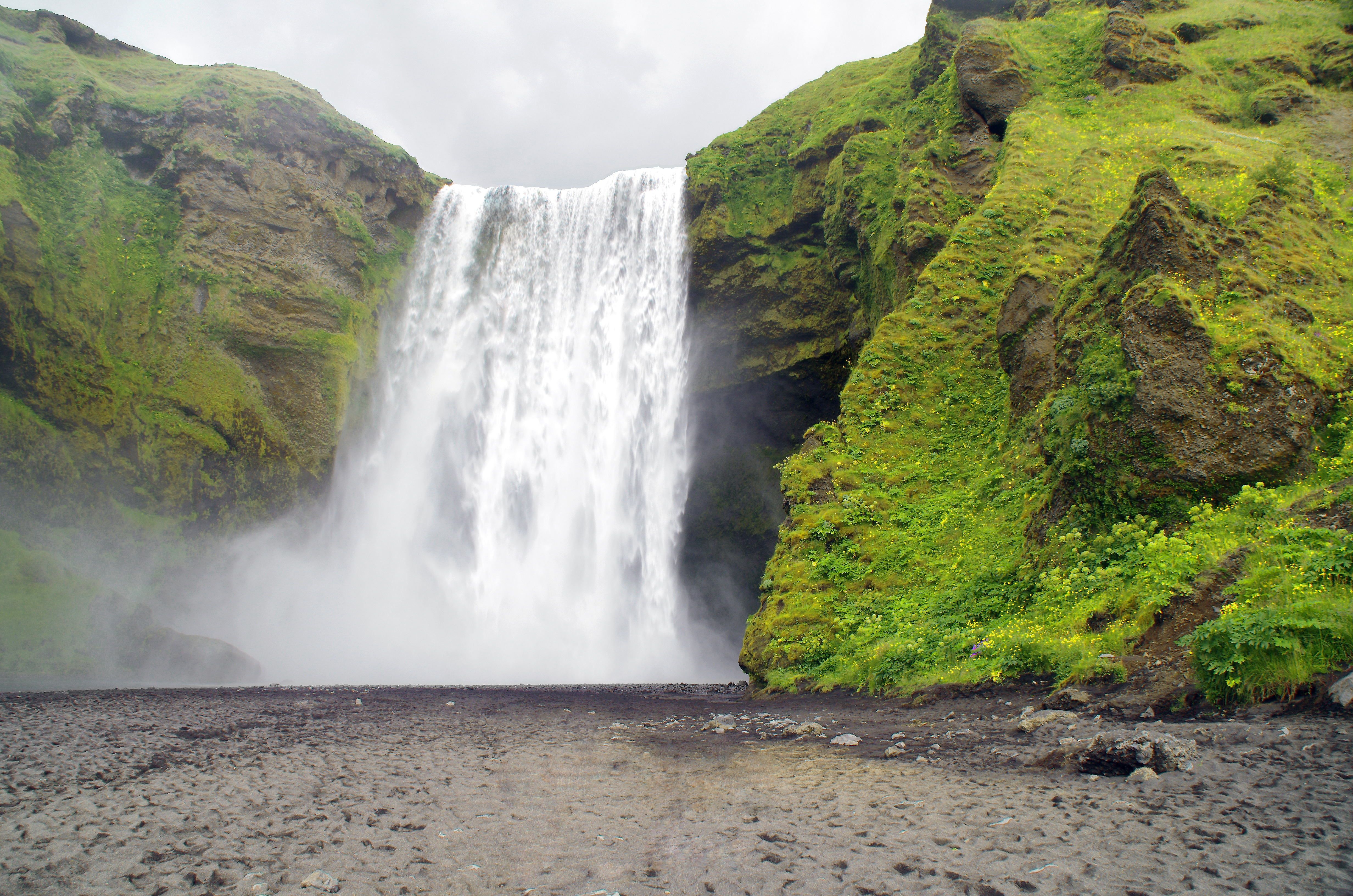 Description: A waterfall with a large waterfall coming out of it's side into the air with a green mossy cliff in the background.
