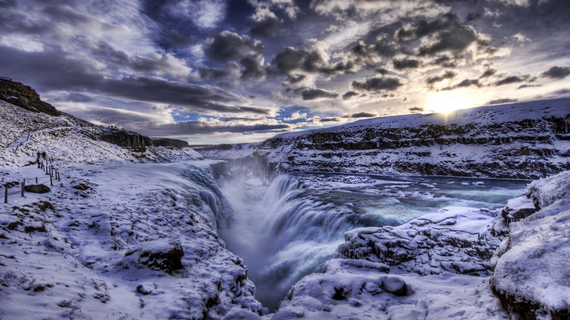Description: A waterfall is surrounded by snow and rocks under a cloudy sky with sun peeking through the clouds above it.