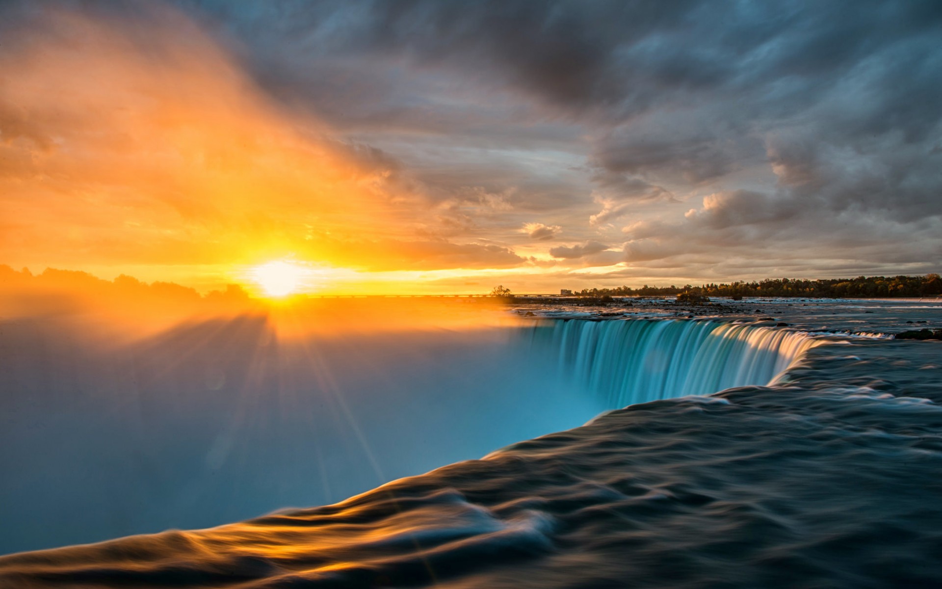 Description: A large waterfall with a sunset in the background and water crashing over it's sides and the sun shining through the clouds.