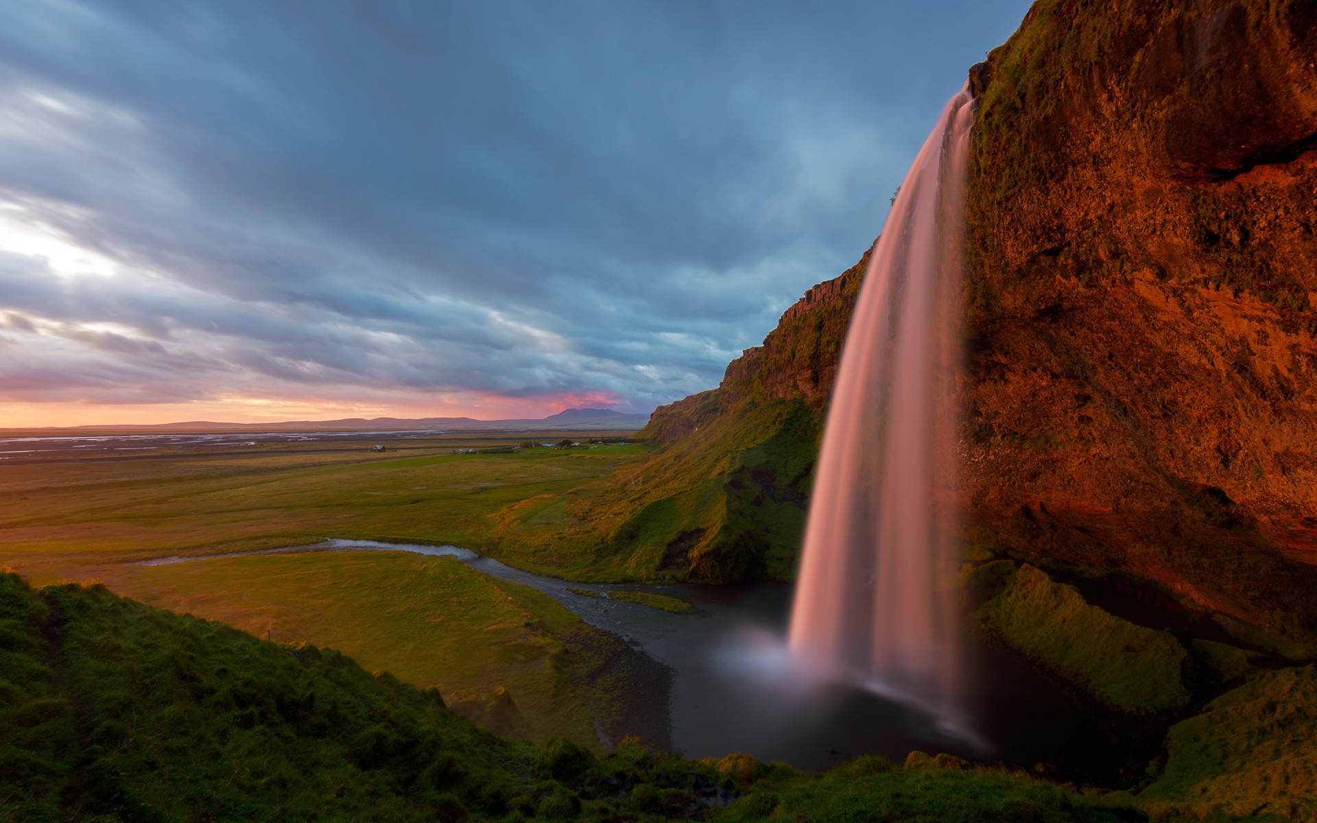 Description: A waterfall is shown at sunset on a hill side with a river running under it and a large rock.