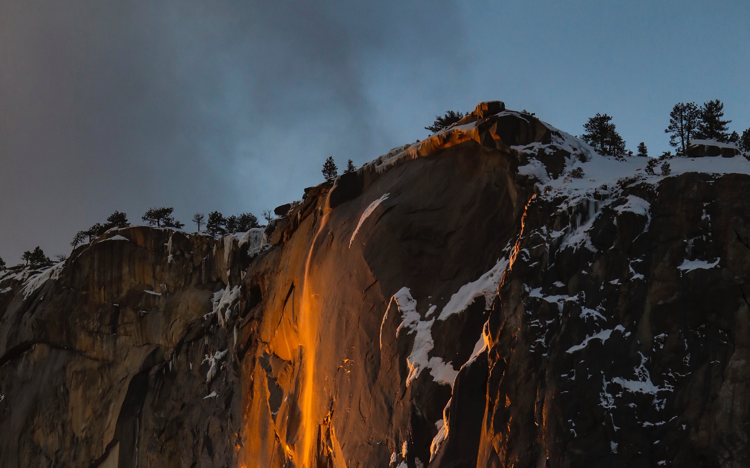 Description: A waterfall is lit up by the sun on a mountain side with snow on the ground and trees on the side.