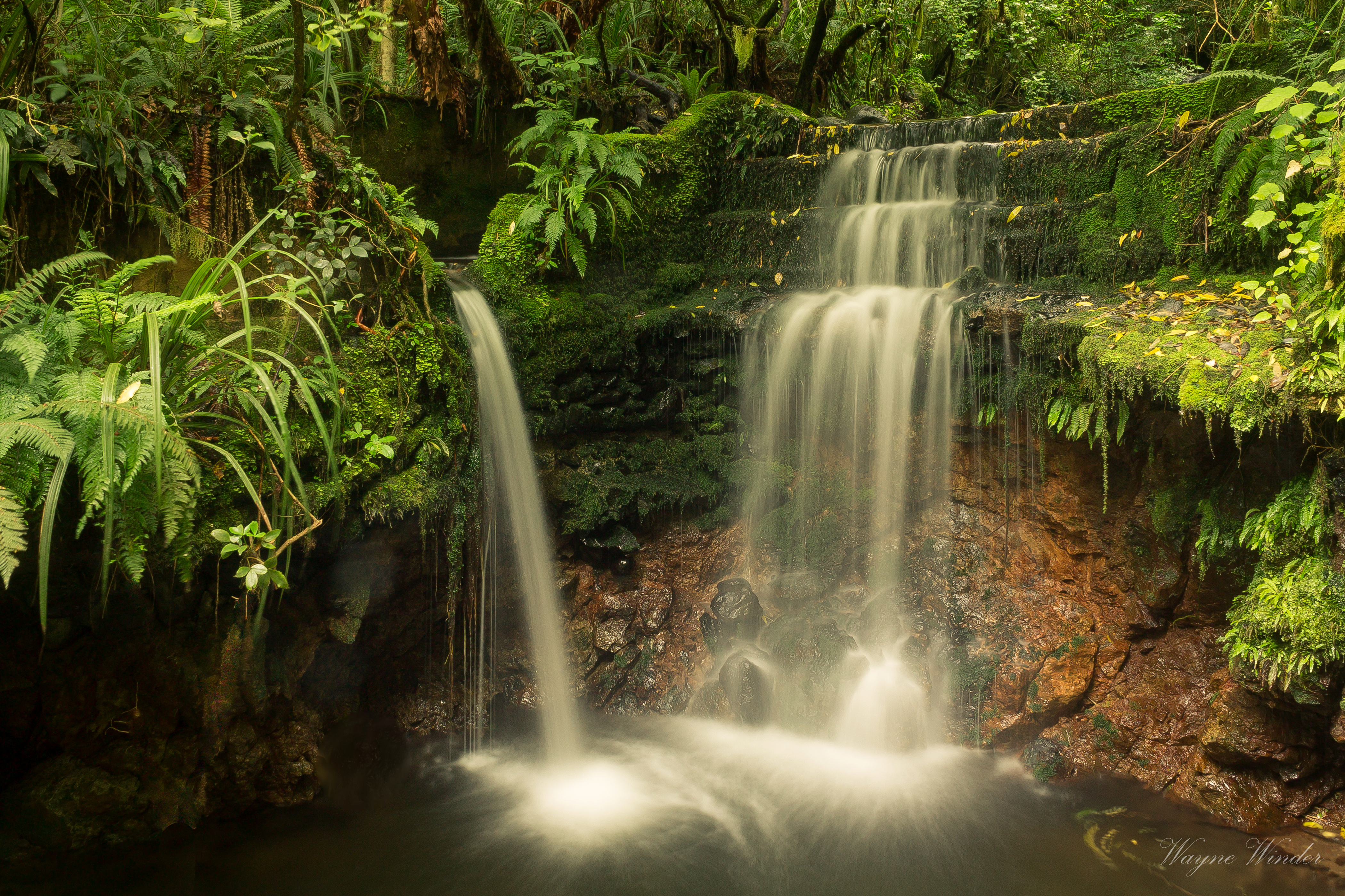 Description: A waterfall in a tropical forest with lots of trees and plants around it and a body of water running through it.