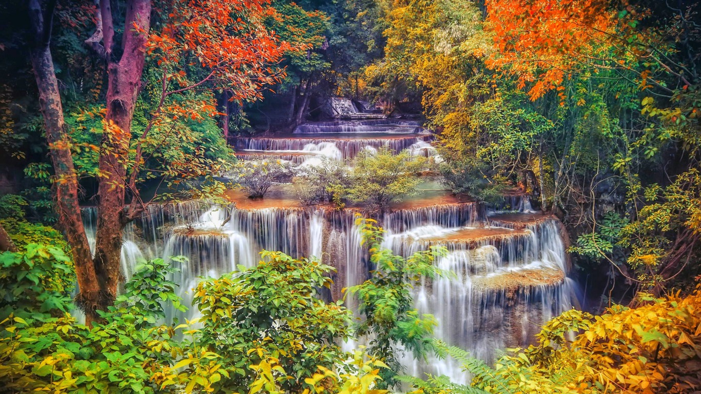Description: A painting of a waterfall in the woods with trees around it and a few leaves on the ground and a few trees in the foreground.