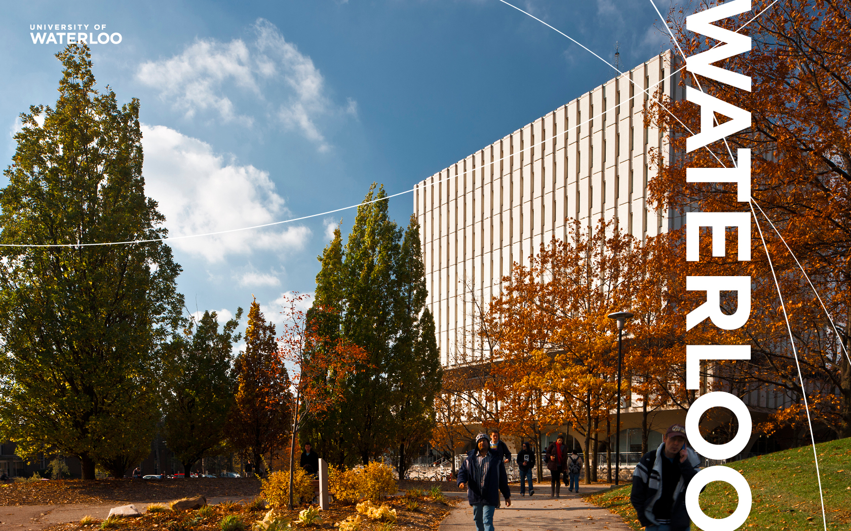 Description: A group of people walking down a sidewalk next to a tall building with a white sign that reads waterloo.