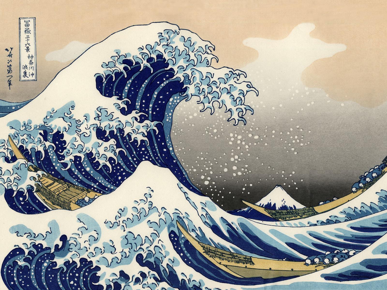 Description: A painting of a wave with a boat in the middle of it and a sky background with clouds and waves.