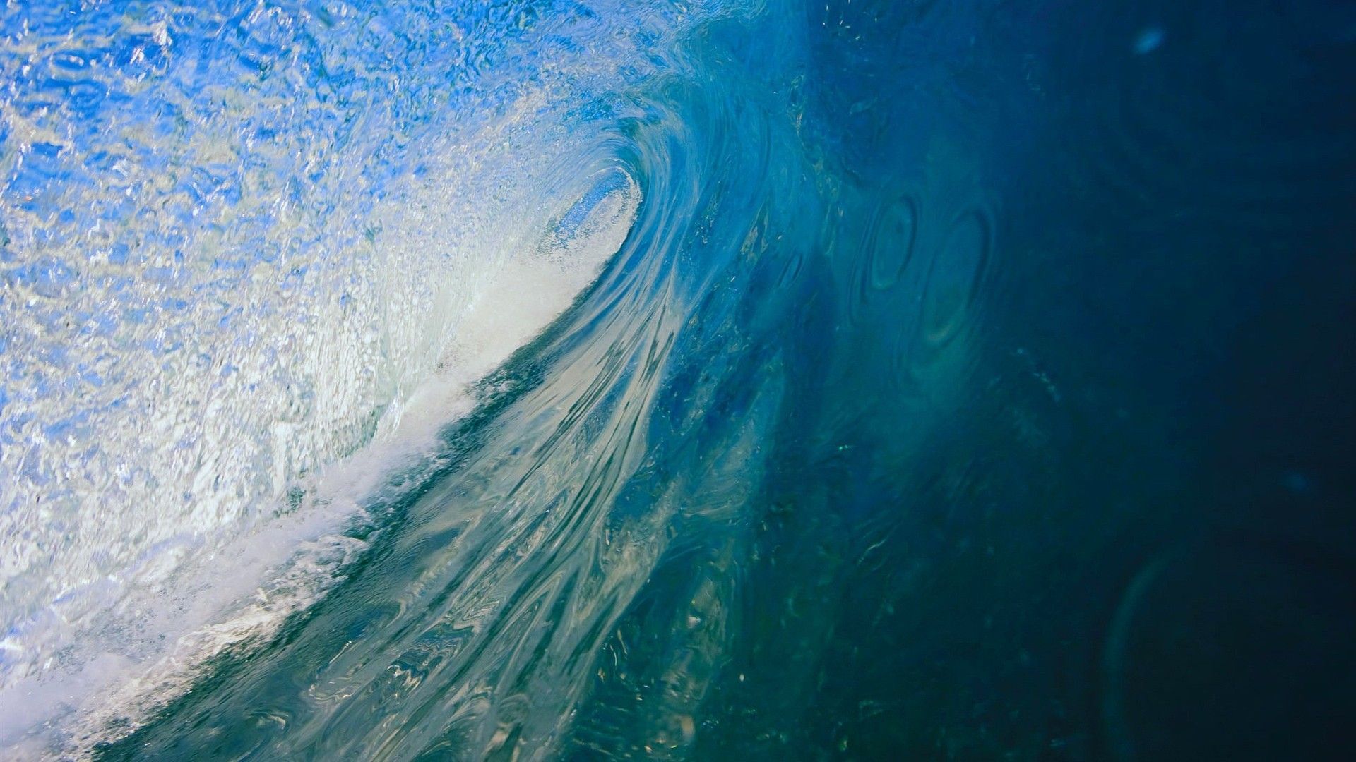 Description: A wave is breaking and the water is blue and white with a small amount of bubbles on it and a person is surfing.