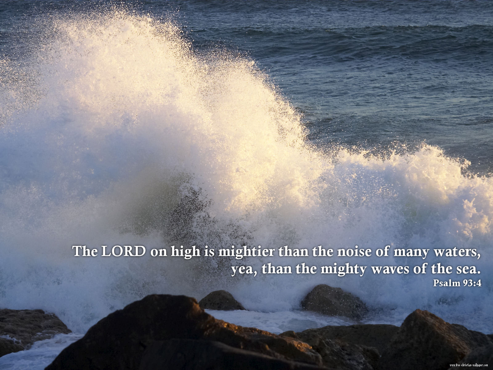 Description: A wave crashing over rocks with a bible verse written on it's side in the background of the photo.