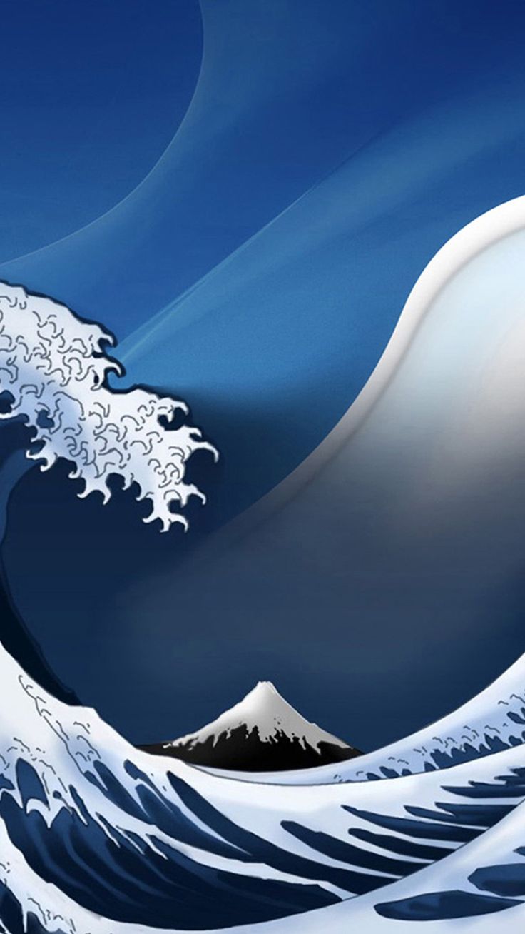 Description: A painting of a wave in the ocean with a mountain in the background and a blue sky with clouds.