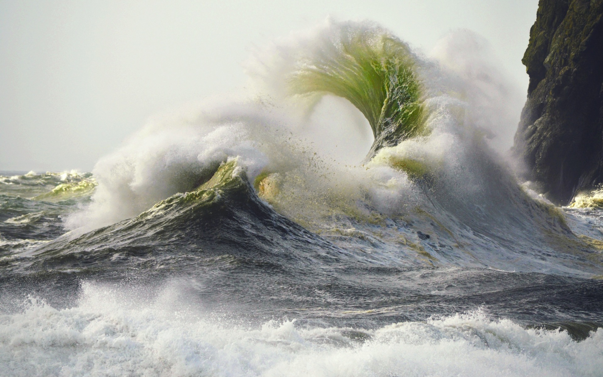 Description: A wave crashes into the ocean with a rock in the background and a cliff in the distance in the distance.