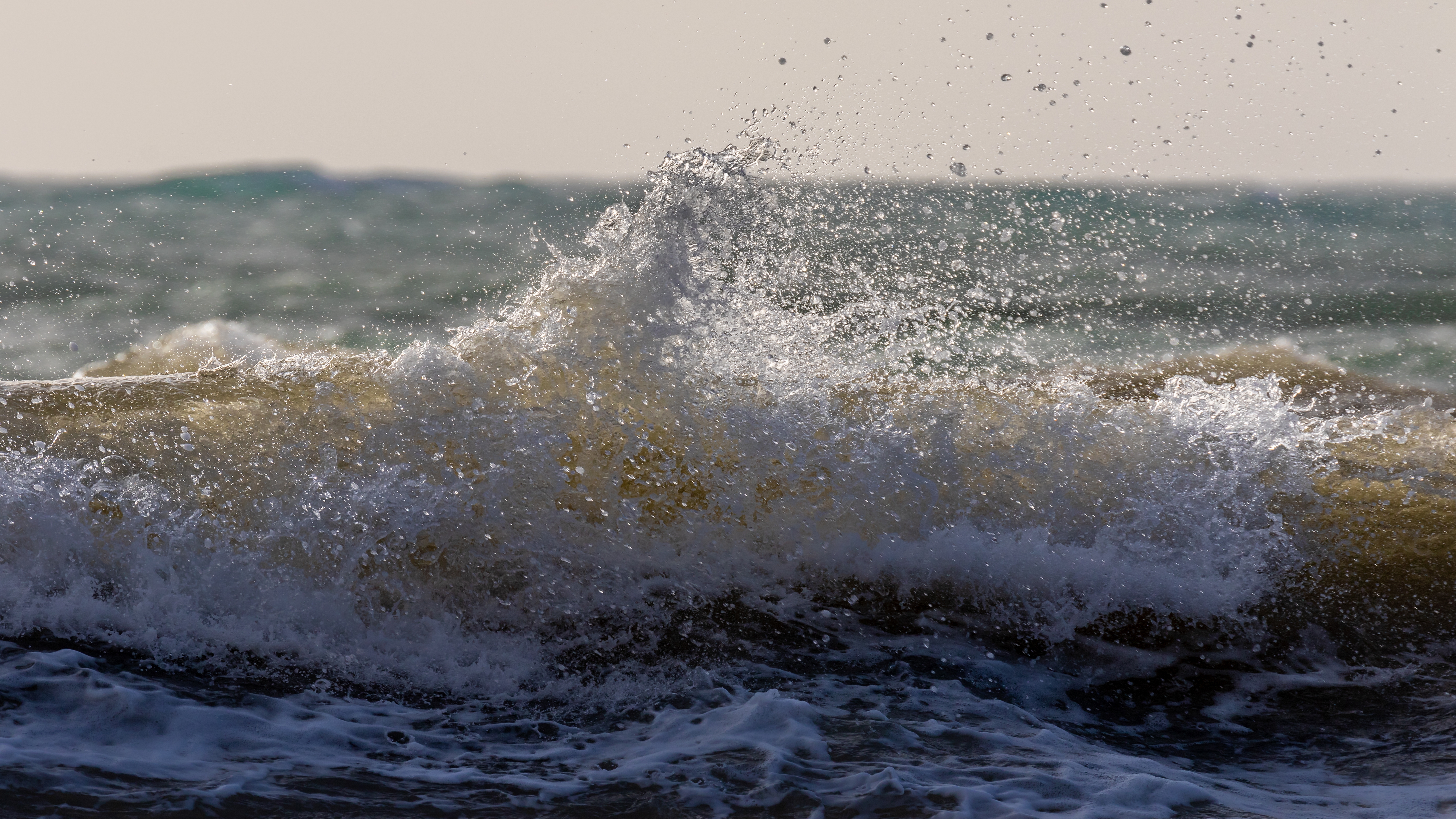 Description: A wave crashes into the ocean with a sky background and a light blue sky in the background.