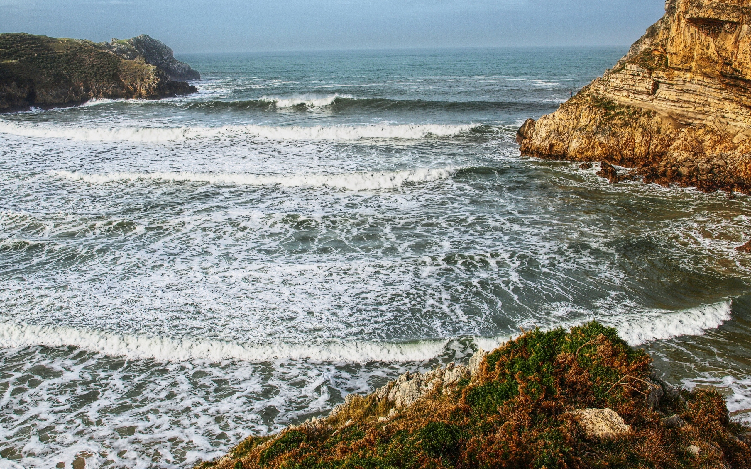 Description: A couple of people riding waves on top of a wave covered beach next to a cliff face with a body of water.