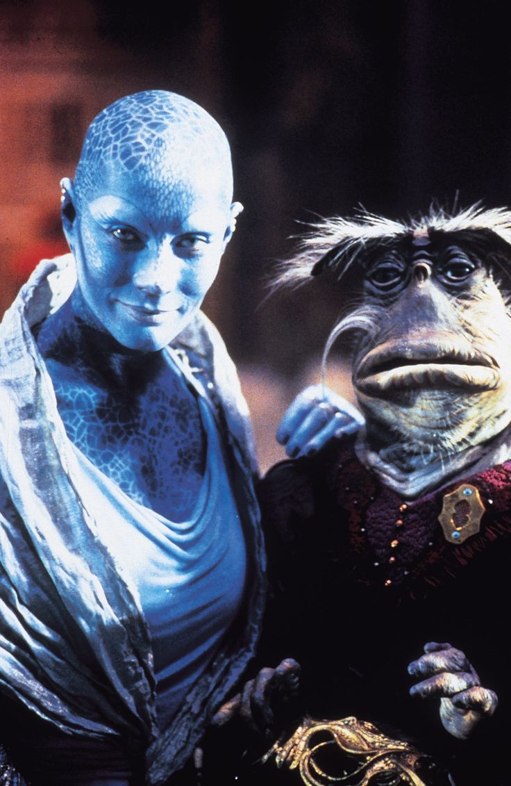 Description: A woman and a man with weird hair and makeup are standing next to each other in a scene from the film star wars.