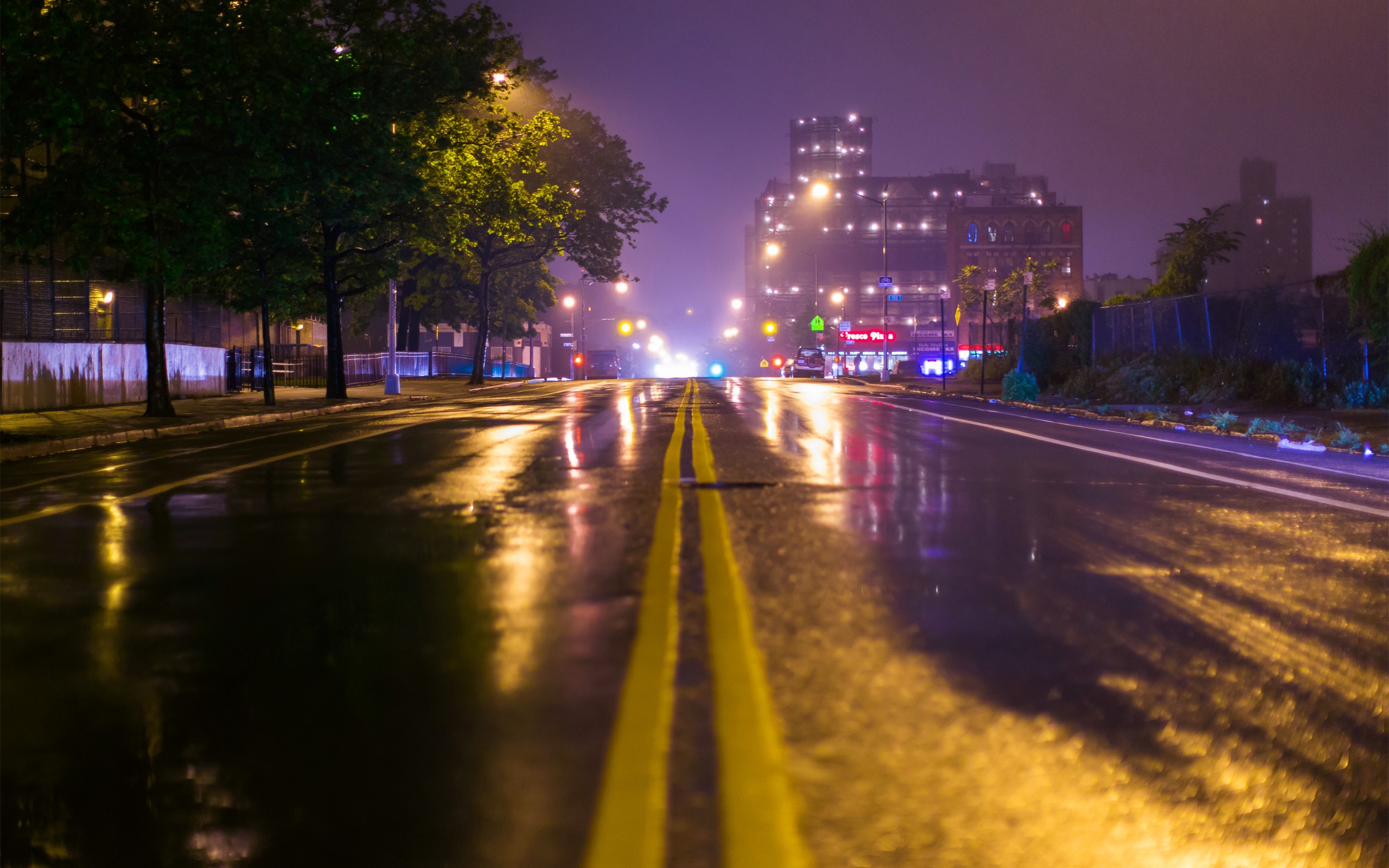 Description: A wet street with a yellow line on the side of it at night time with buildings in the background.