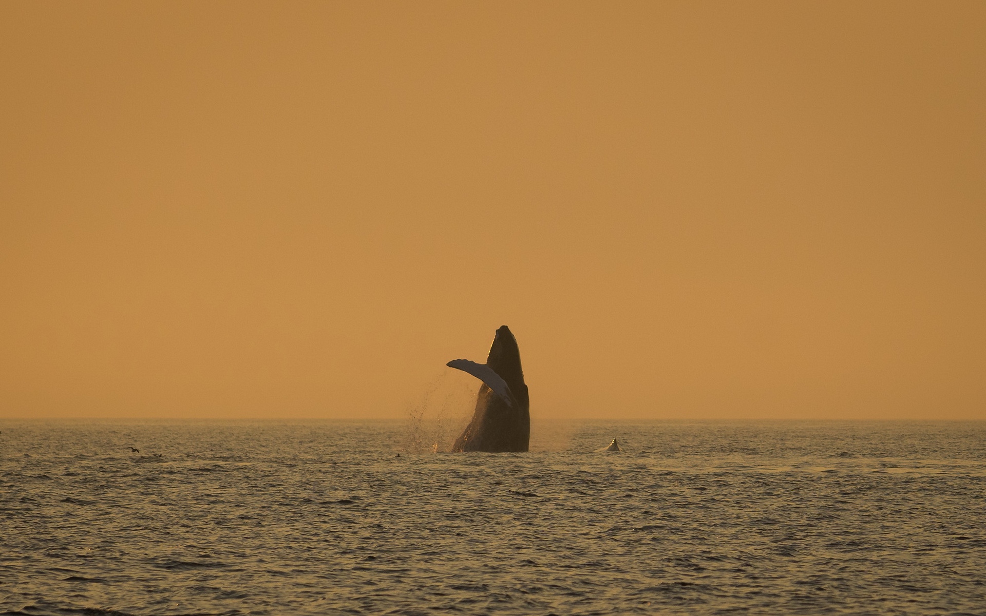 Description: A whale is jumping out of the water at sunset or dawn or dawn.