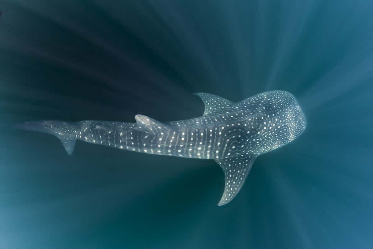 Description: A whale swimming in the ocean with a light shining on it's face and a fish swimming in the water.