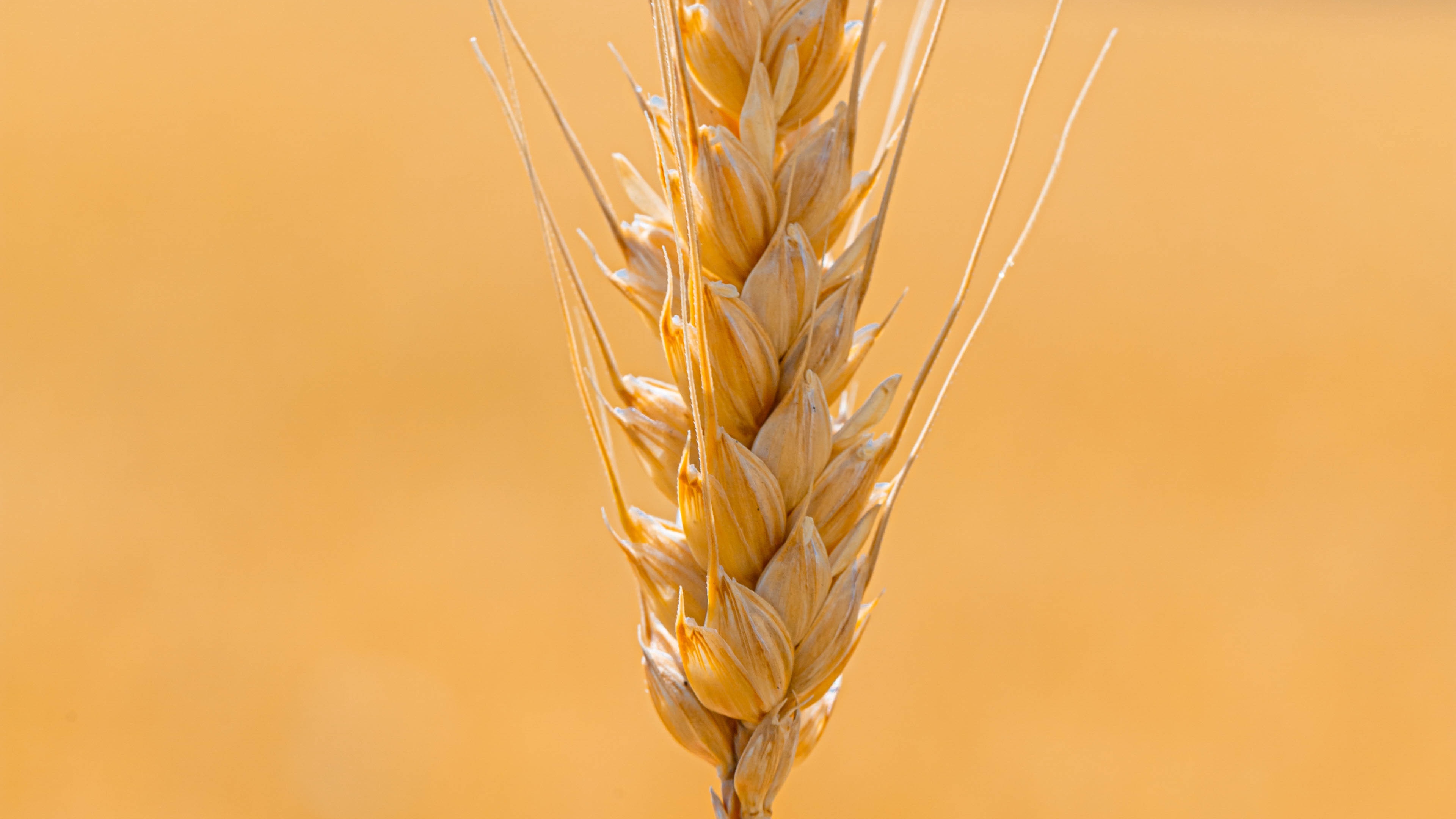 Description: A close up of a wheat plant with a yellow background and a bird perched on top of it.