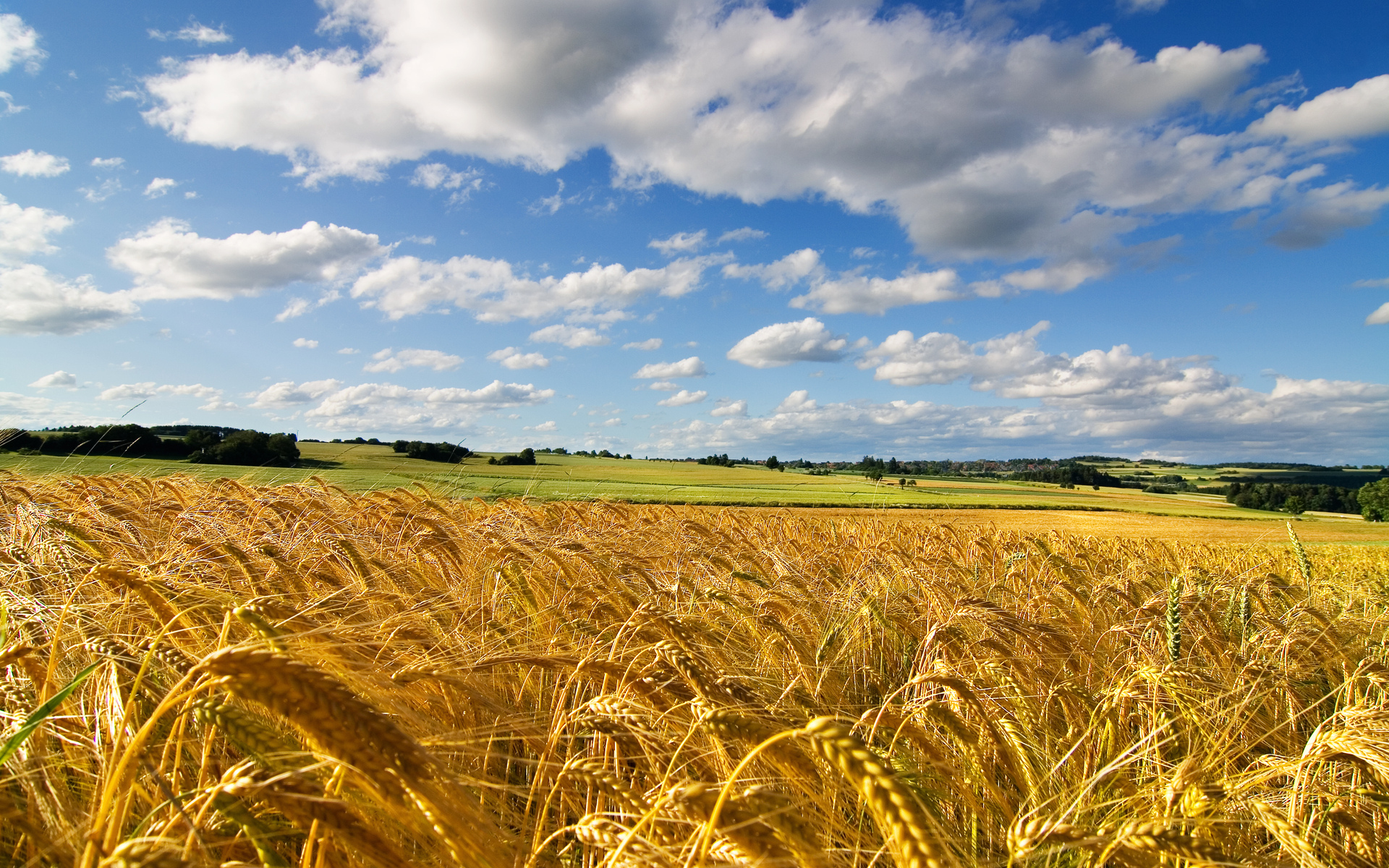 Description: A field of wheat under a blue sky with clouds in the background and a few trees in the foreground.