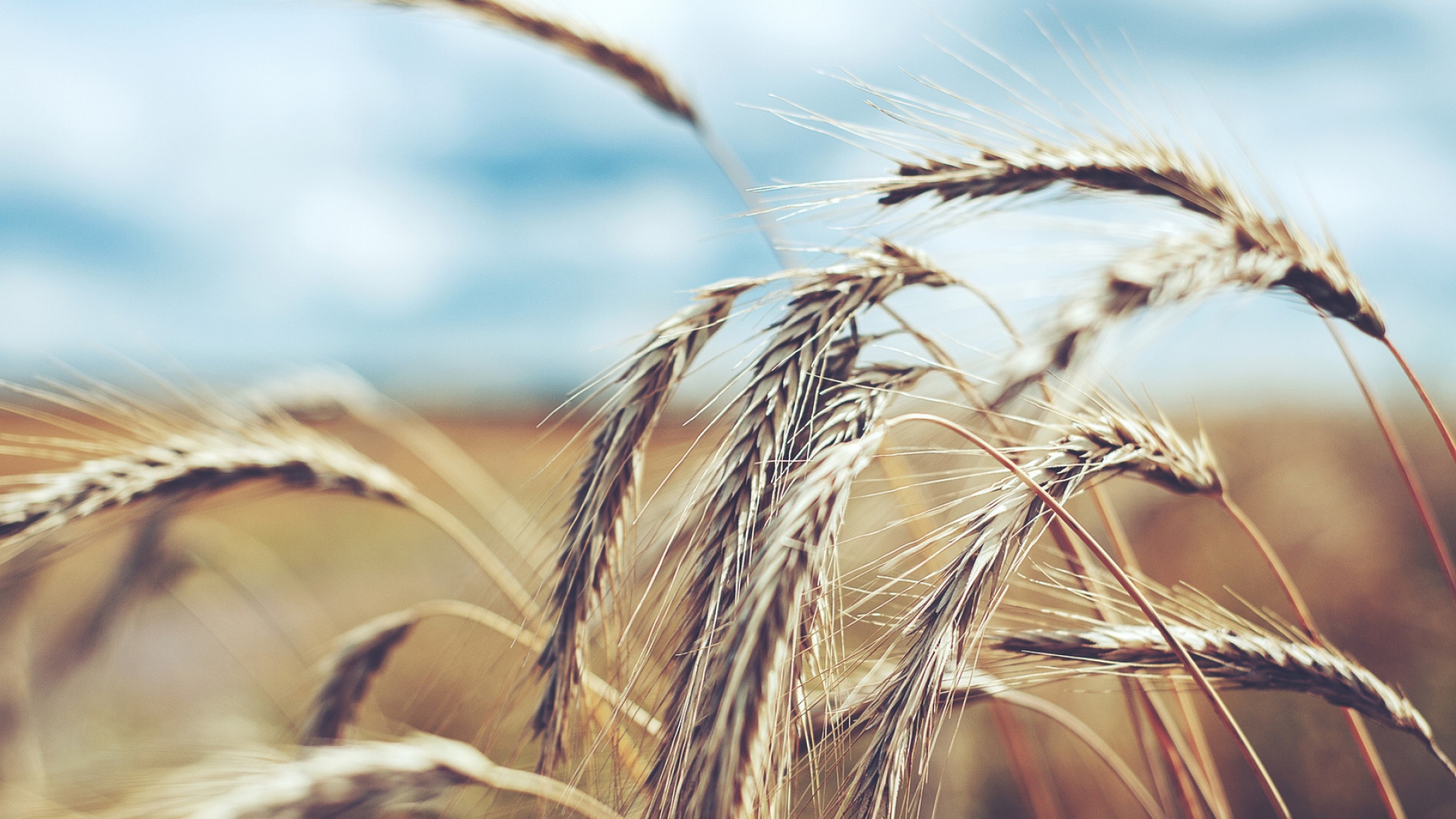 Description: A close up of a wheat field with a blue sky in the background and a few clouds in the sky.