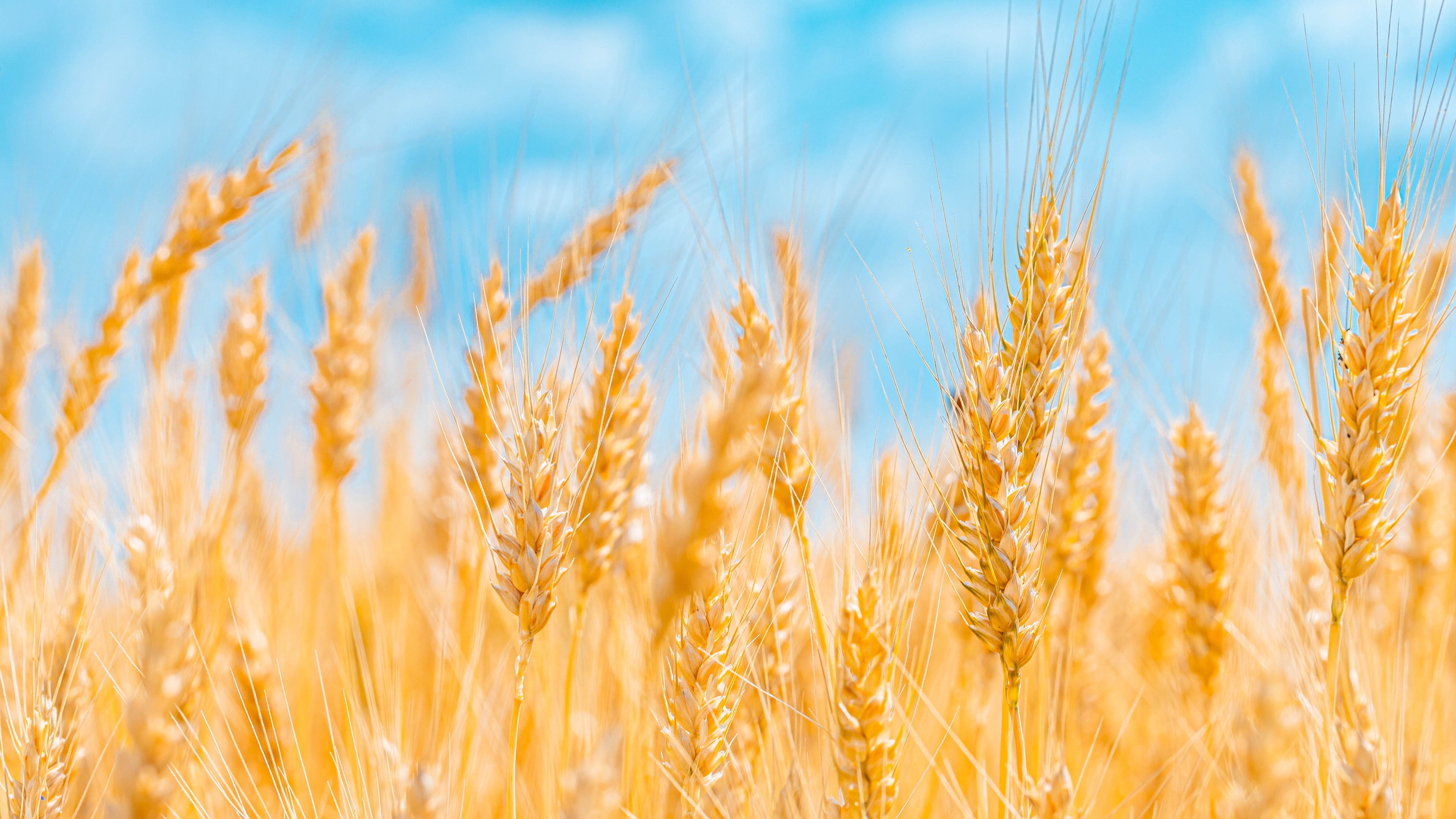 Description: A field of wheat is shown against a blue sky with clouds in the background and a few small clouds in the sky.
