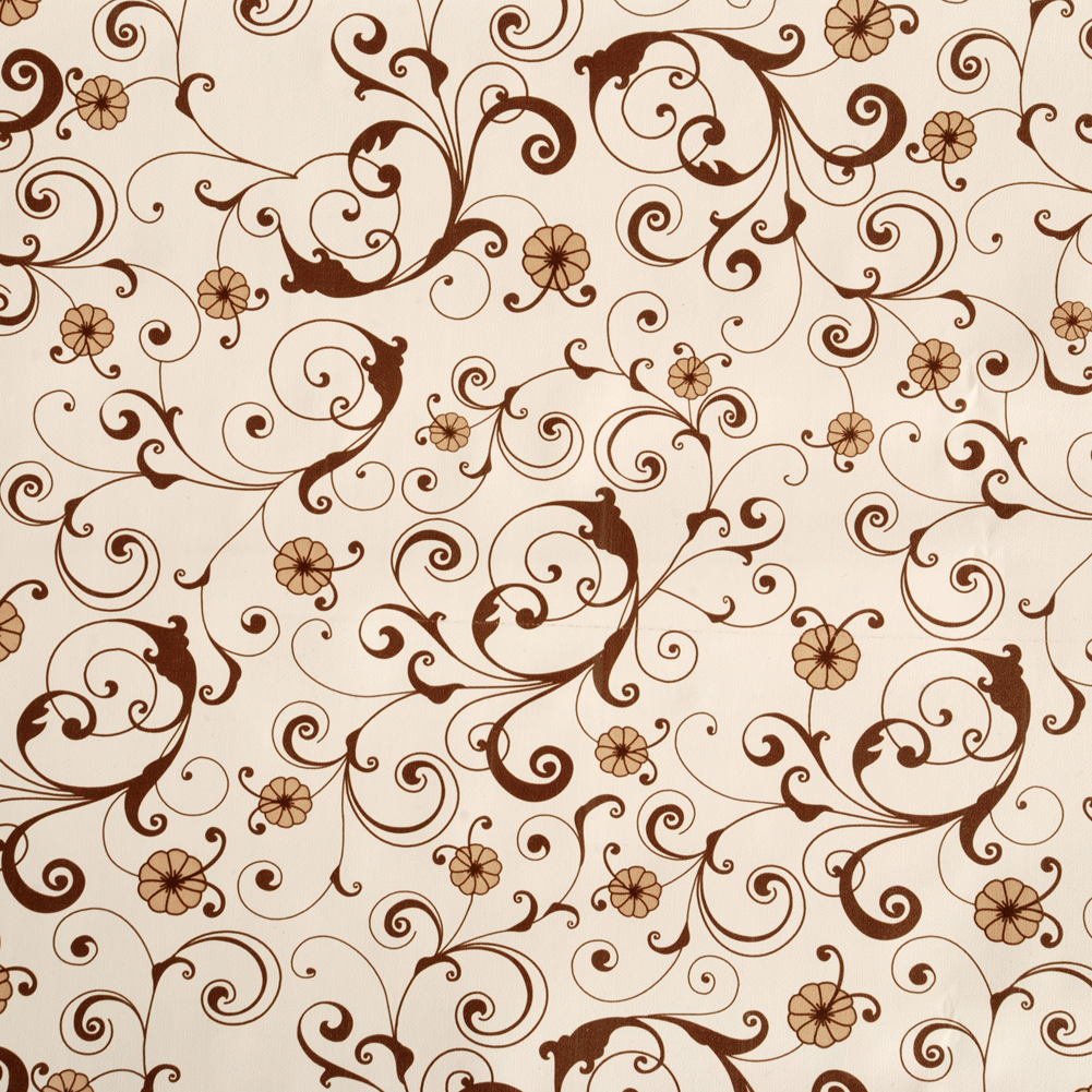 Description: A white background with brown swirls and flowers on it.