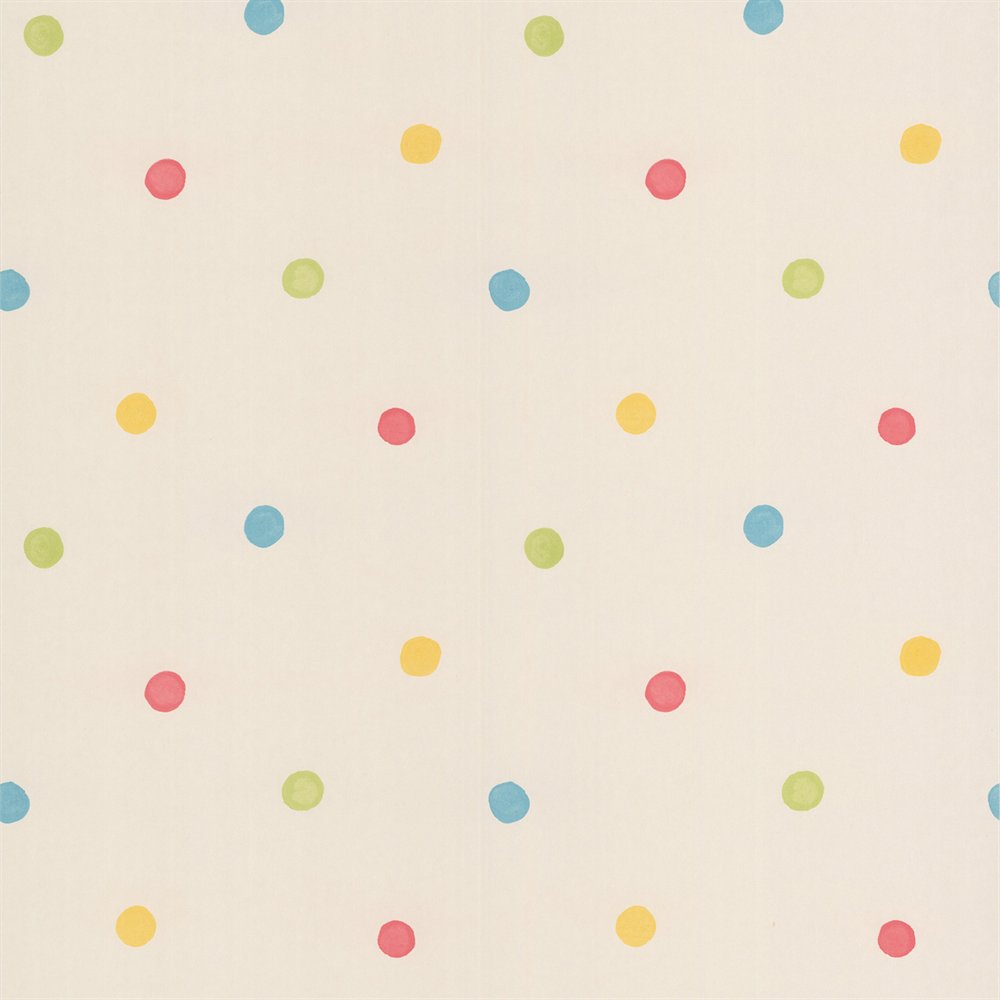 Description: A white background with multicolored polka dots on it.