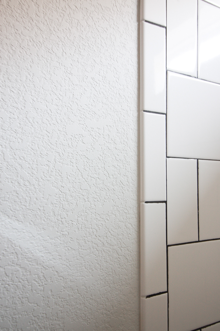 Description: A white bathroom with a white tile wall and a white toilet seat cover and a black and white toilet.