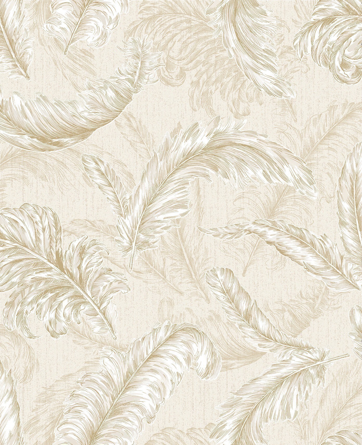 Description: A white and beige wallpaper with a leaf pattern on it's side and a white background with a light brown leaf pattern on it.